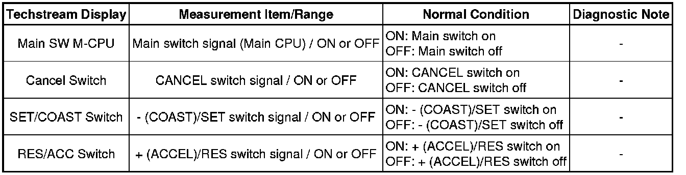 (e) Check the Data List for proper functioning of the cruise control main switch.