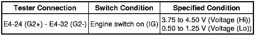(g) While turning the crankshaft pulley by hand, measure the voltage between each terminal. Check that the voltage changes between the Hi range and Lo range shown in the table below.