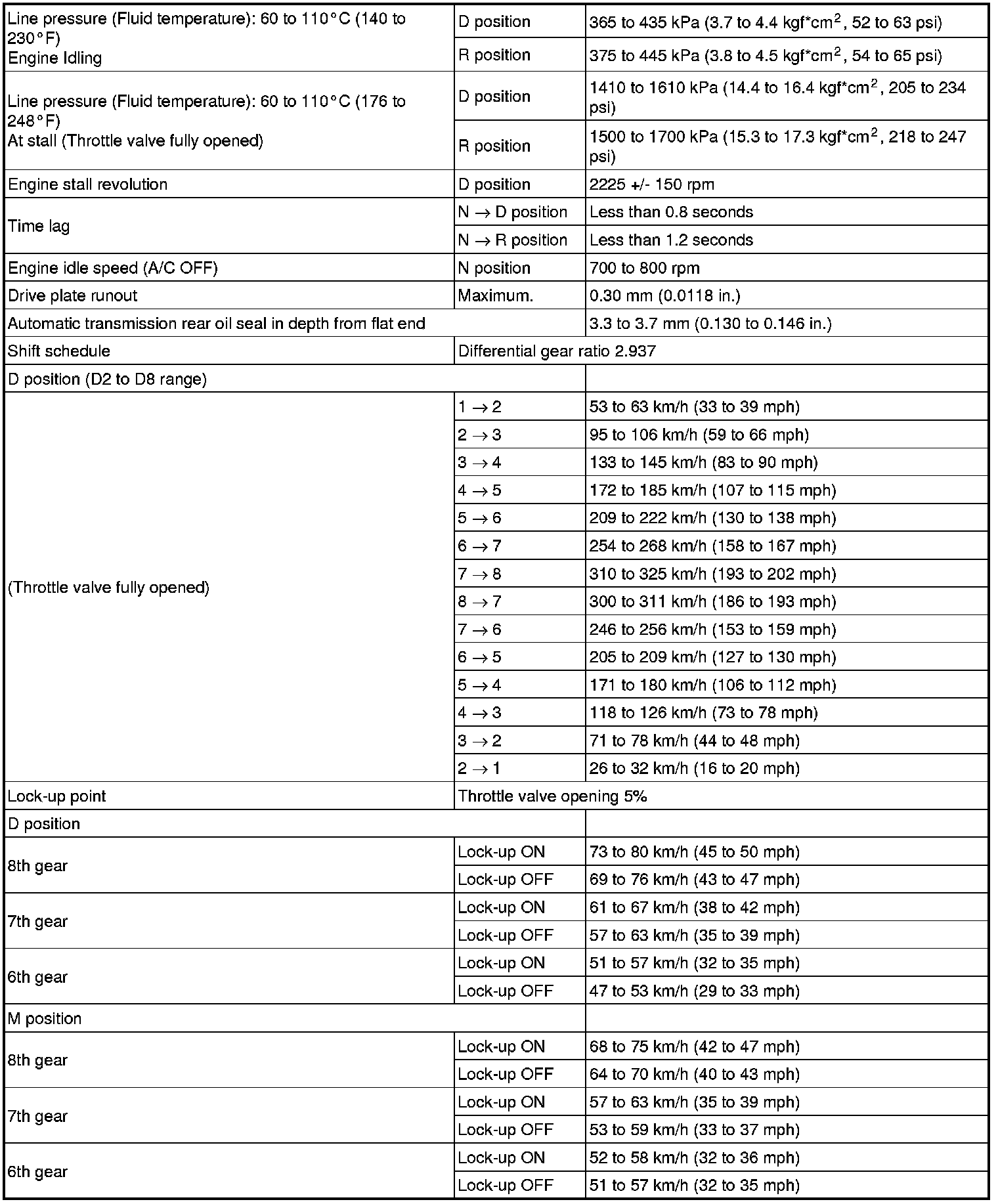 * All shift point values indicated in the above tables are actual values. Therefore, if checking a shift point with a chassis dynamometer, keep in mind that there is a range of error in the chassis dynamometer indication.