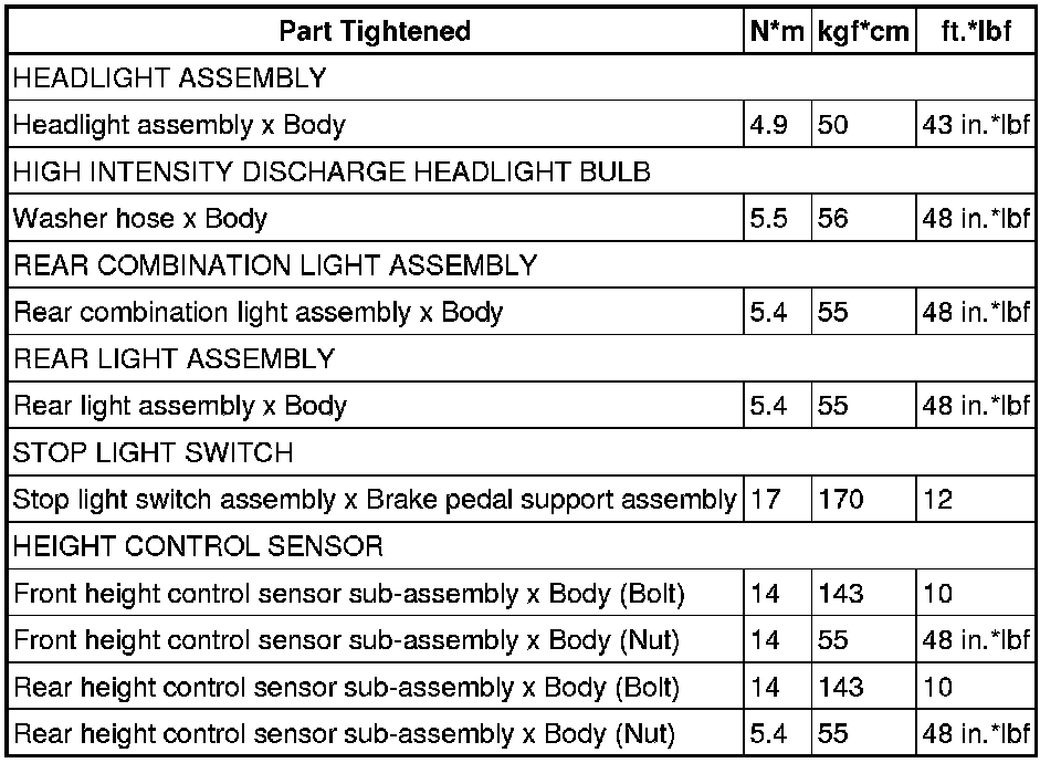 SPECIFICATIONS: LIGHTING (EXT): TORQUE SPECIFICATIONS