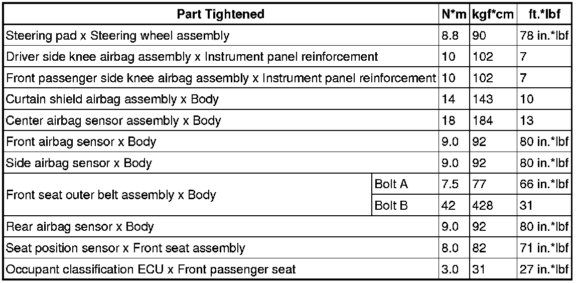 SPECIFICATIONS: SUPPLEMENTAL RESTRAINT SYSTEMS: TORQUE SPECIFICATIONS