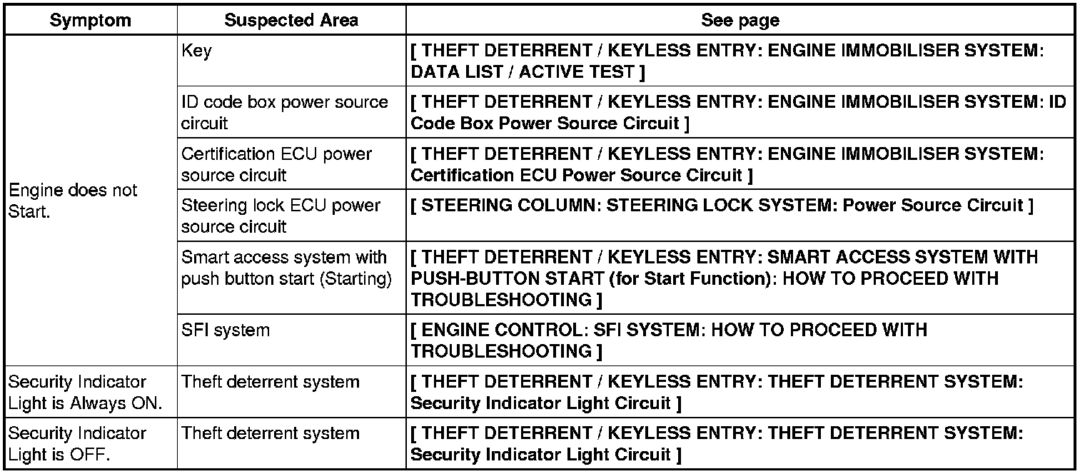 THEFT DETERRENT / KEYLESS ENTRY: ENGINE IMMOBILISER SYSTEM: PROBLEM SYMPTOMS TABLE