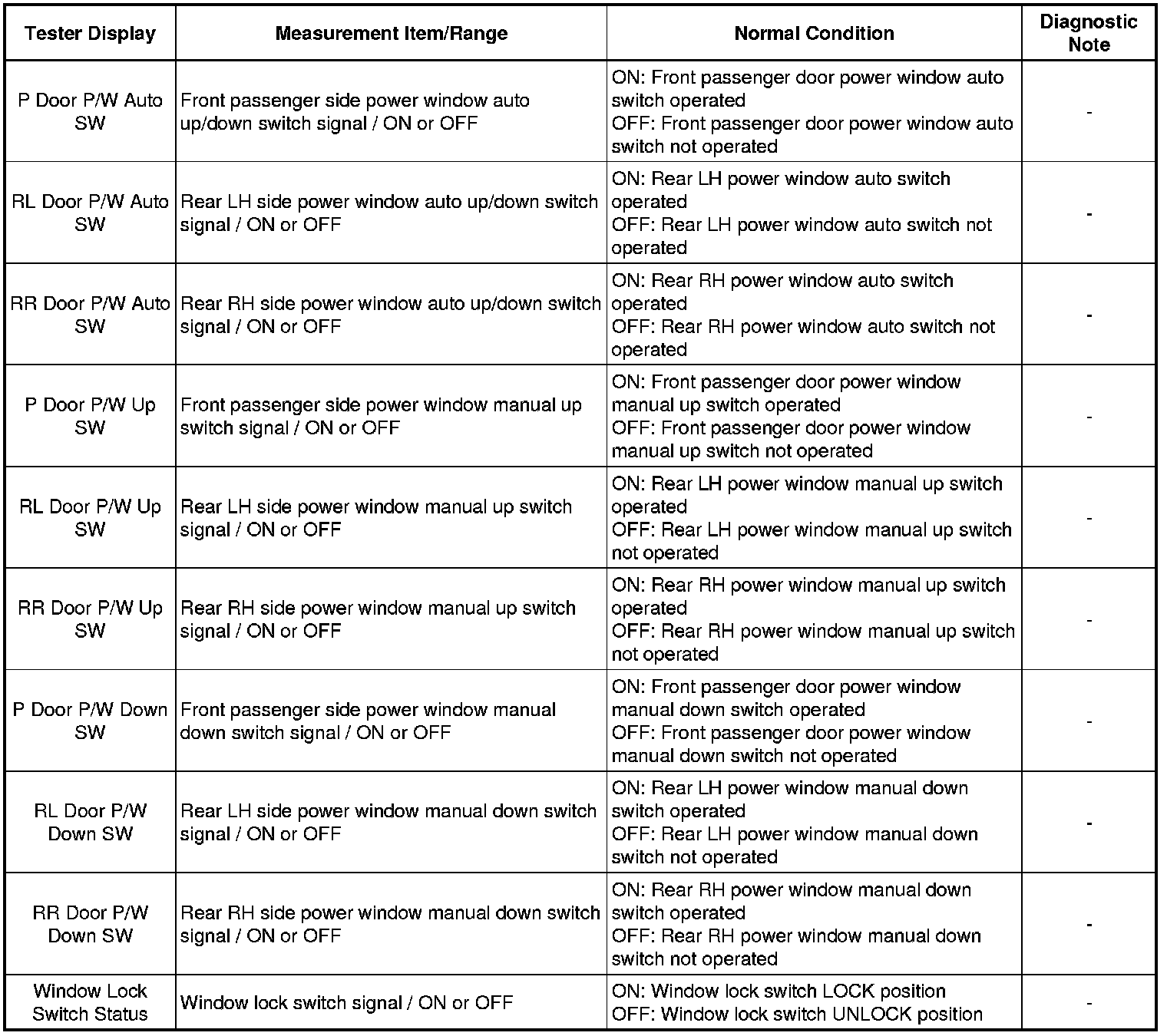 When the engine switch is on (IG), the multiplex network master switch assembly sends remote up/down signals to each power window regulator motor assembly via the LIN communication line.