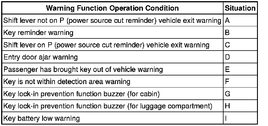 When any of the situations below occur, the smart access system with push-button start responds to alert the driver.