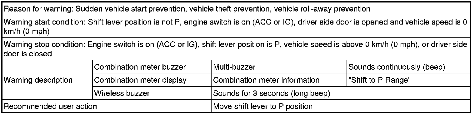 (1) With shift lever in position other than P, door is opened and vehicle exit (while holding key) is attempted