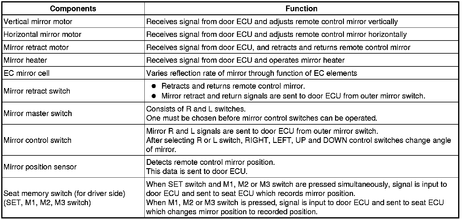 (a) This system has the following functions: automatic glare-resistant electrochromic (EC) mirror, reverse shift-linked mirror, electrical remote control type mirror, memory function, and rear window defogger-linked mirror heater.