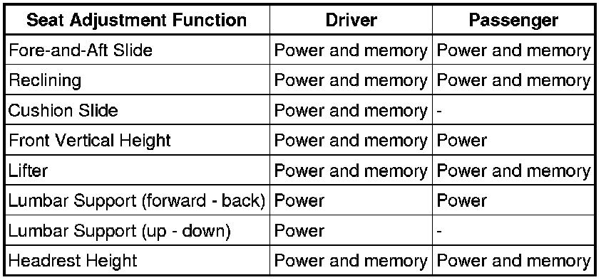 The front power seat functions which can be adjusted with power seat motors and/or memorized are shown in the chart below.