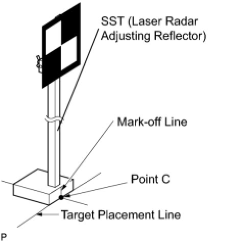 (2) Hang a weight with a pointed tip from the center of the target sheet. Then with double-sided tape, attach the target sheet to the reflector so that the weight aligns with the mark-off line of the SST (laser radar adjusting reflector).