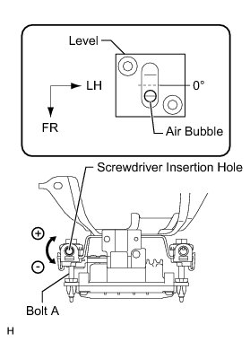 * If "LEFT SIDE: 1.0°" is displayed, the divergence is 1.0° in the left direction. Turn bolt B approximately 14.8 turns to the negative (-) side.