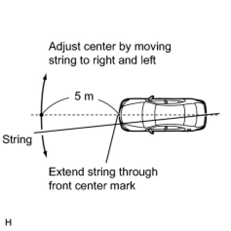 (2) Set one end of the 10 m (32.8 ft.) string on the vehicle rear's center point. Run the string over the vehicle front's center point to a position 5 m (16.4 ft.) beyond the vehicle front's center point, as shown in the illustration. Mark the 5 m (16.4 ft.) position.