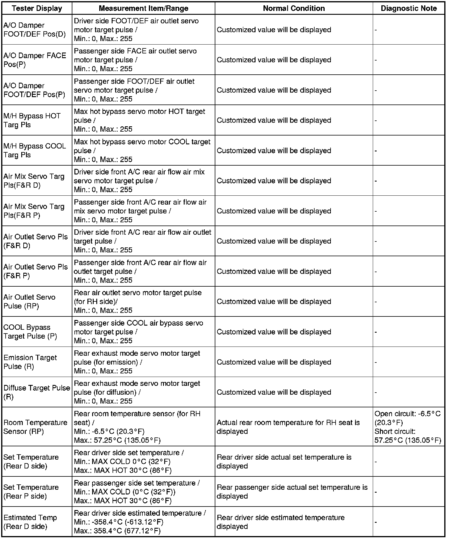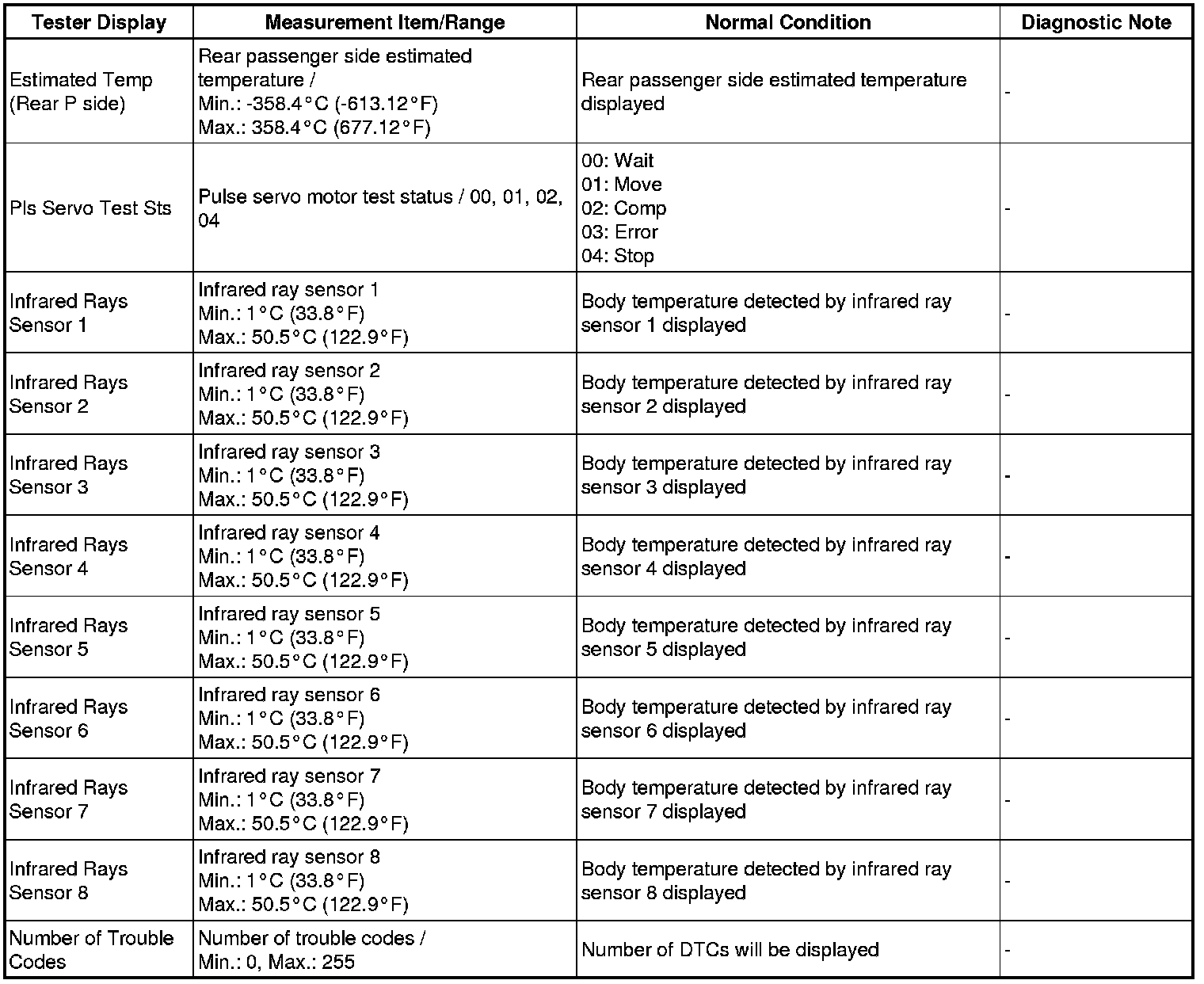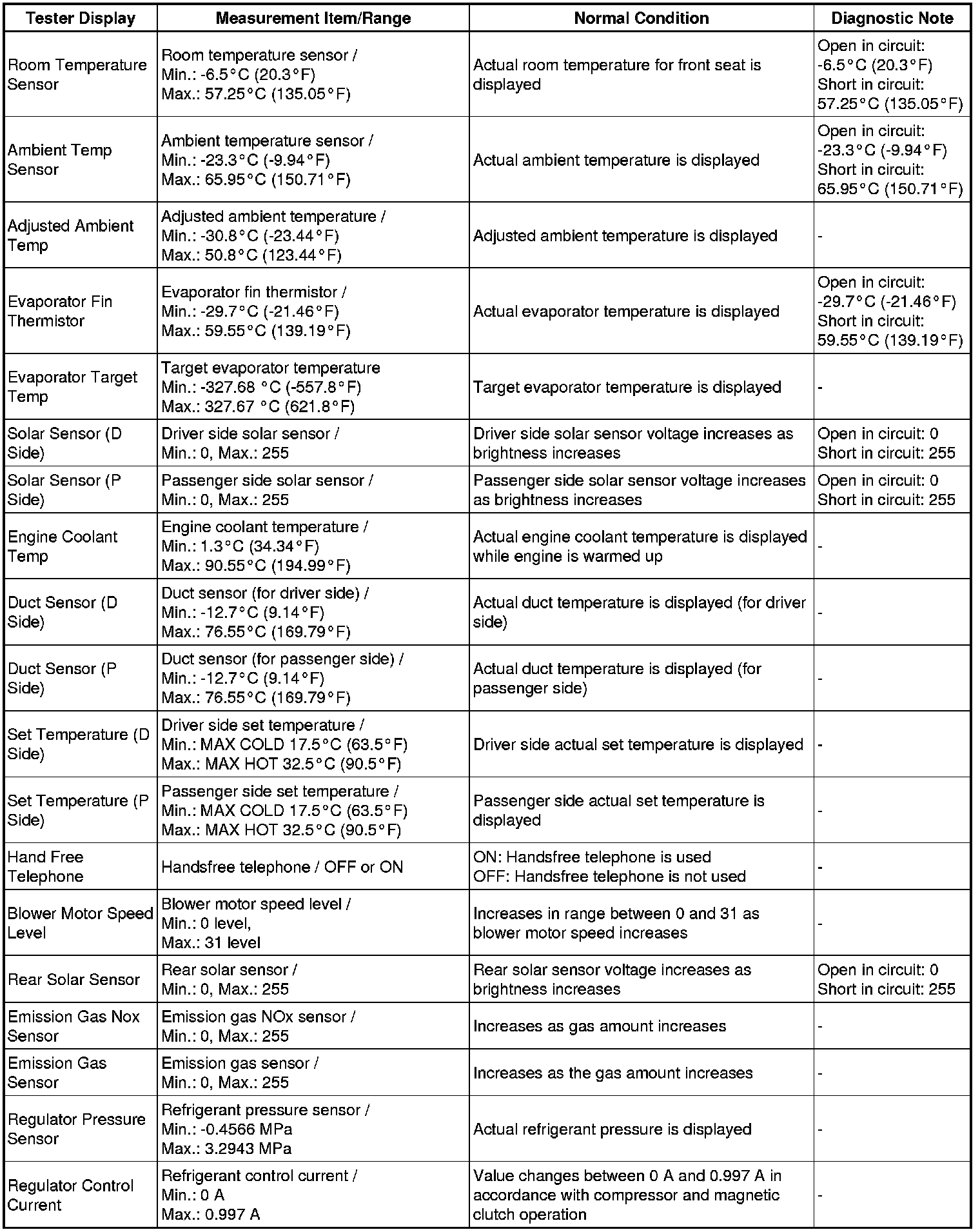 In the table below, the values listed under "Normal Condition" are reference values. Do not depend solely on these reference values when deciding whether a part is faulty or not.