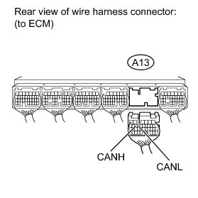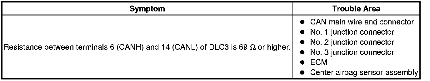 There may be an open circuit in the CAN main wire and/or the DLC3 branch wire when the resistance between terminals 6 (CANH) and 14 (CANL) of the DLC3 is 69 Ohms or higher.