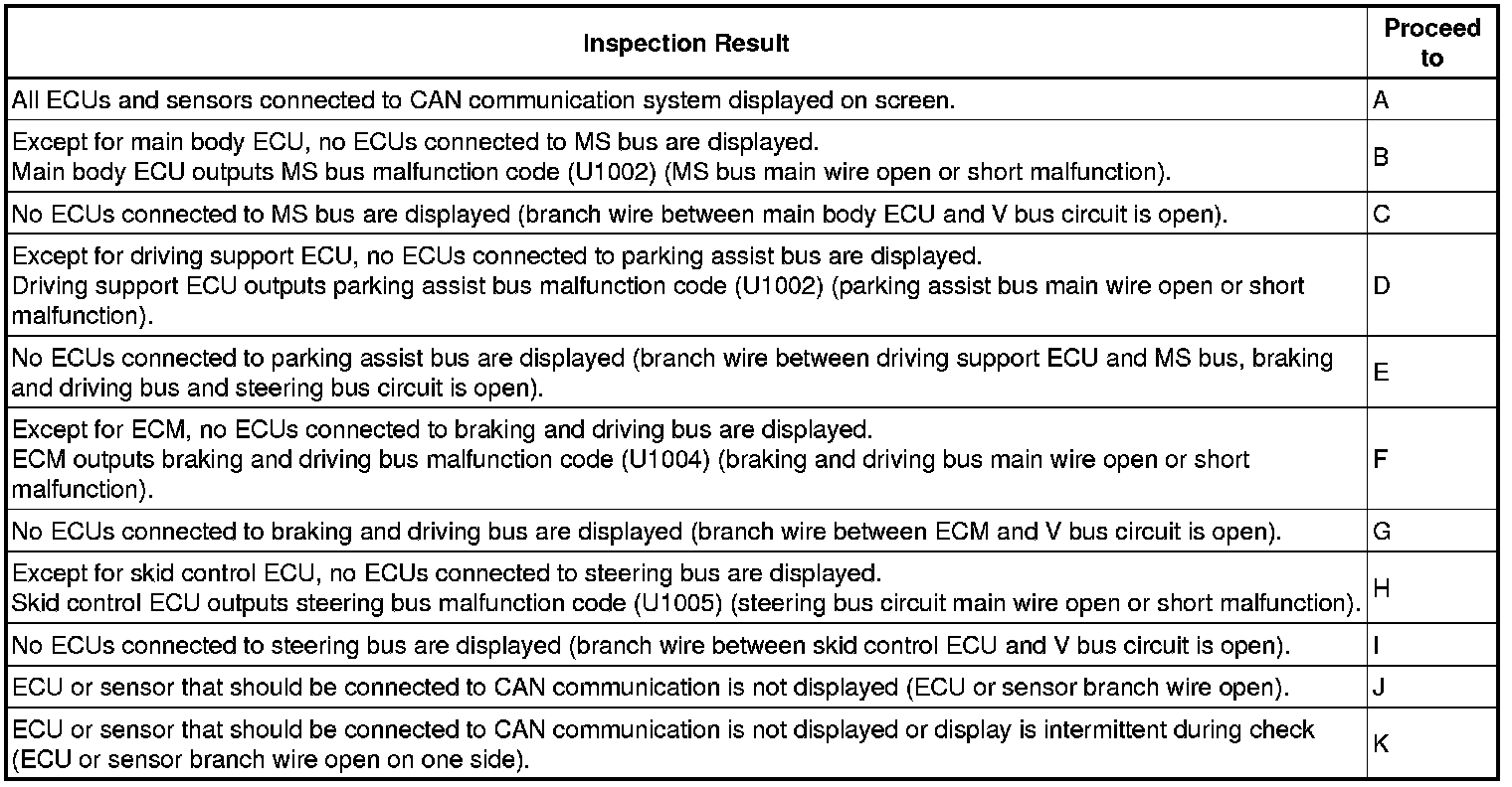 * The gateway ECU built into the ECM may be malfunctioning if both of the following occurs: 1) all ECUs connected to the braking and driving bus are not displayed on the Techstream; and 2) DTC U1004 is not output.