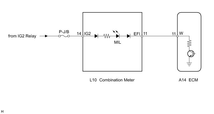 The MIL (Malfunction Indicator Lamp) is used to indicate vehicle malfunction detections by the ECM. By turning the engine switch on (IG), power is supplied to the MIL circuit, and the ECM provides the circuit ground which illuminates the MIL.