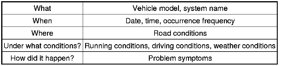 The most difficult case in troubleshooting is when no problem symptoms occur. In such a case, a thorough problem analysis must be carried out. A simulation of the same or similar conditions and environment in which the problem occurred in the customer's vehicle should be carried out. No matter how much skill or experience a technician has, troubleshooting without confirming the problem symptoms will lead to important repairs being overlooked and mistakes or delays.