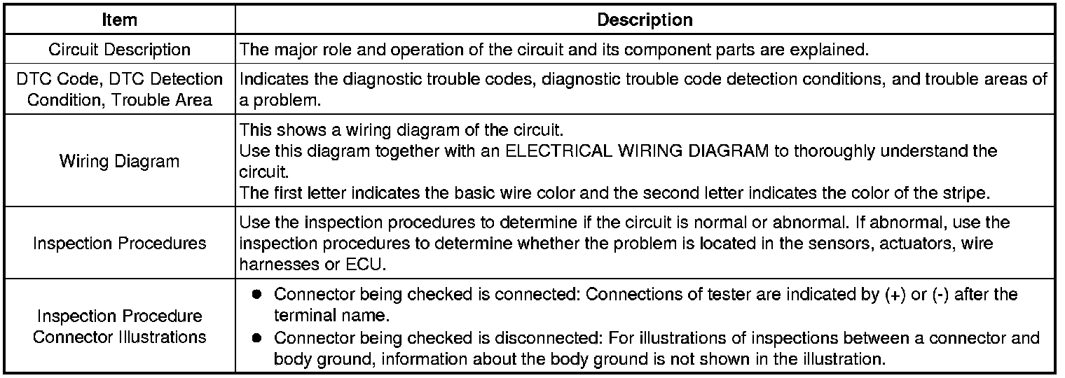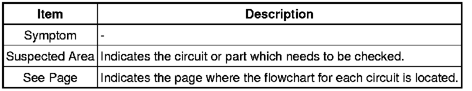When a "Normal" code is output during a DTC check but the problem is still occurring, use the Problem Symptoms Table. The suspected areas (circuits or parts) for each problem symptom are in the table. The suspected areas are listed in order of probability. A description of each of the chart's columns is below.