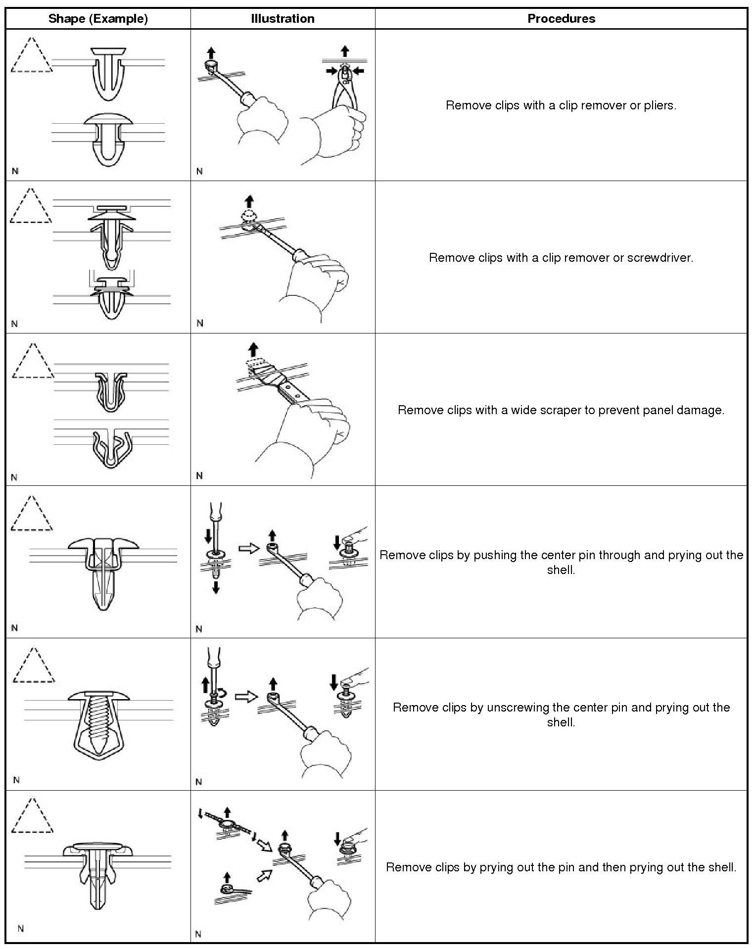 (1) The removal and installation methods of typical clips used for vehicle body parts are shown in the table below.