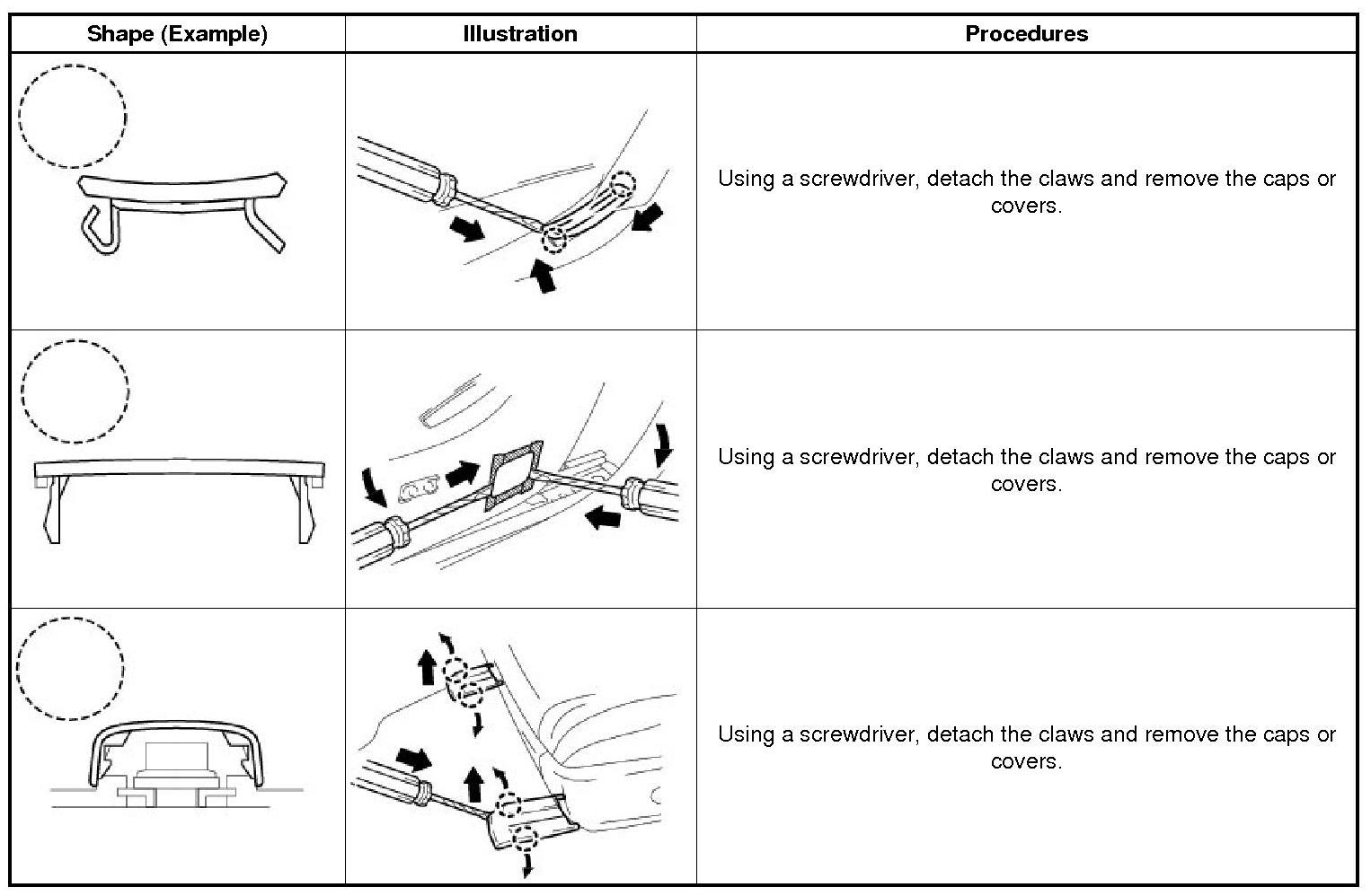 (1) The removal and installation methods of typical claws used for vehicle body parts are shown in the table below.