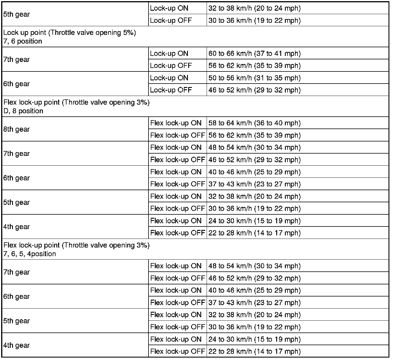 * All shift point values indicated in the above tables are actual values. Therefore, if checking a shift point with a chassis dynamometer, keep in mind that there is a range of error in the chassis dynamometer indication.