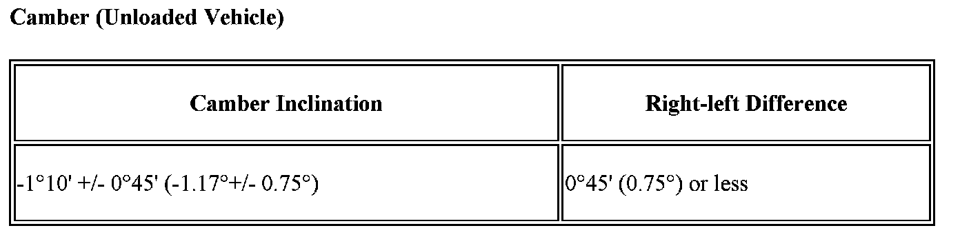 HINT: Camber is not adjustable. If the measurement is not within the specified range, inspect the suspension parts for damage and/or wear, and replace them if necessary.