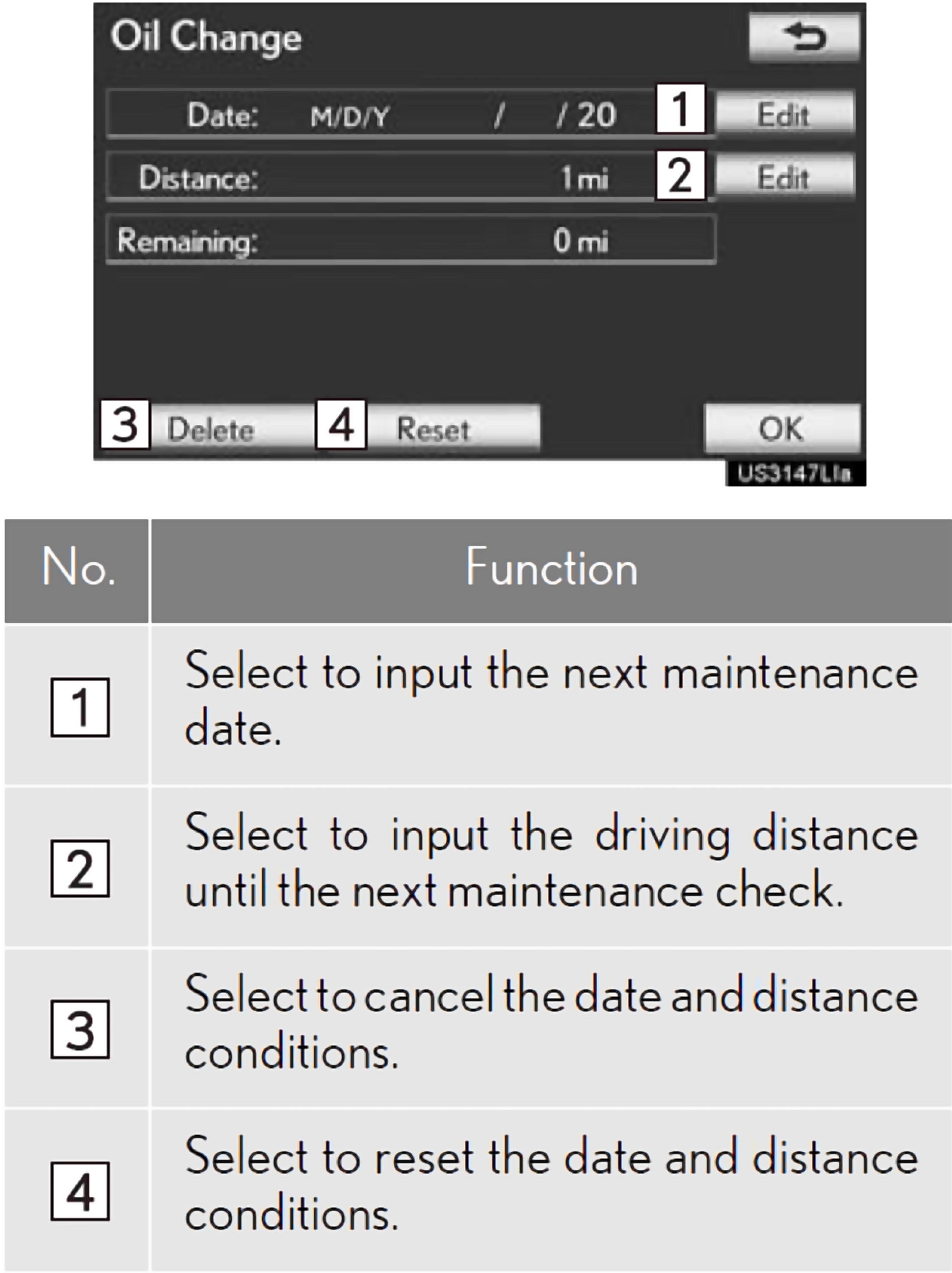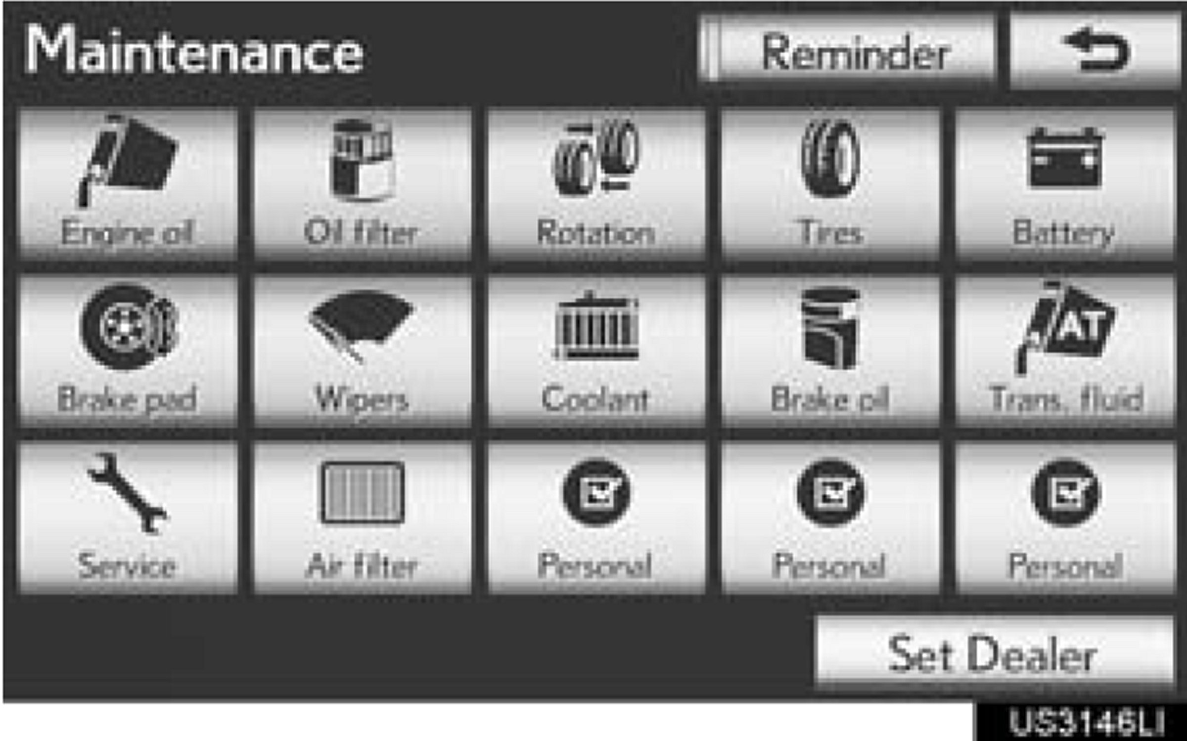 When the navigation system is turned on, the "Maintenance Reminder" screen displays when it is time to replace a part or certain components.