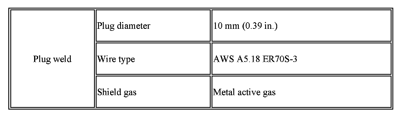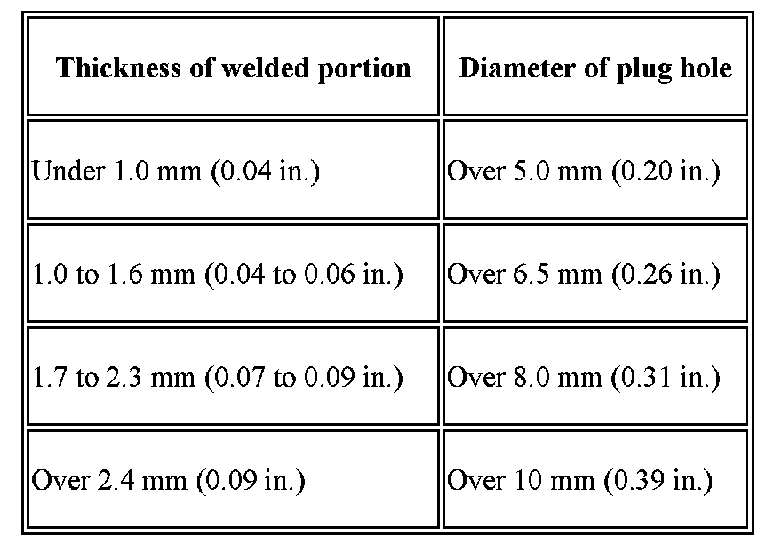 NOTICE: Be sure to use Metal active gas (Ar 80% + CO2 20%) as the shield gas when plug welding. Sufficient weld strength cannot be assured when using 100% CO2 shield gas.
