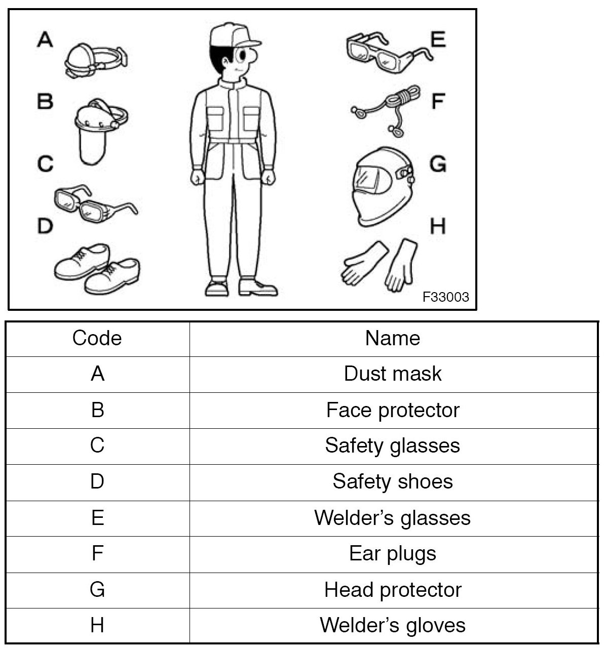 1. In addition to the usual mechanic's wear, cap and safety shoes, the appropriate gloves, head protector, welders glasses, ear plugs, face protector, dust mask, etc. should be worn as the situation demands.
