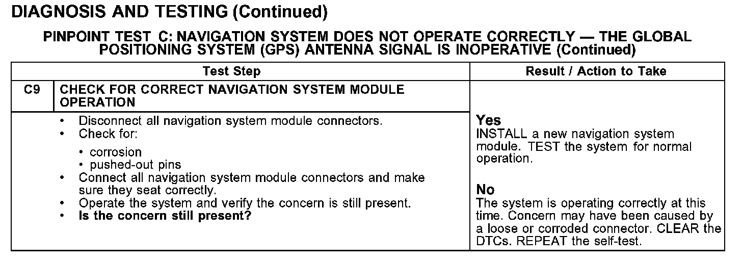 PINPOINT TEST C: NAVIGATION SYSTEM DOES NOT OPERATE CORRECTLY - THE GLOBAL POSITIONING SYSTEM (GPS) ANTENNA SIGNAL IS INOPERATIVETest C1-C3: