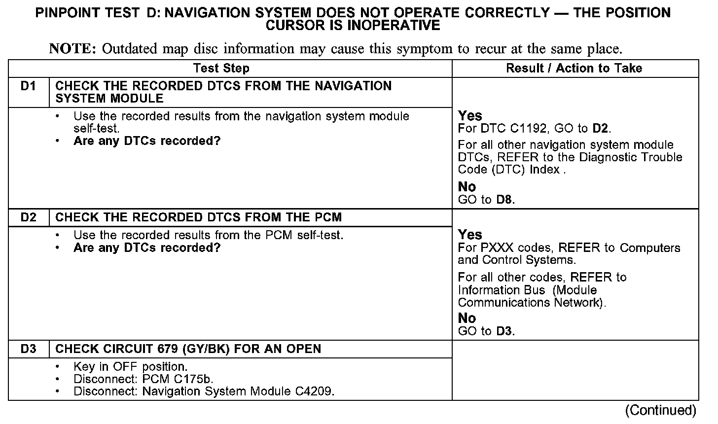 PINPOINT TEST D: NAVIGATION SYSTEM DOES NOT OPERATE CORRECTLY - THE POSITION CURSOR IS INOPERATIVETest D1-D3:
