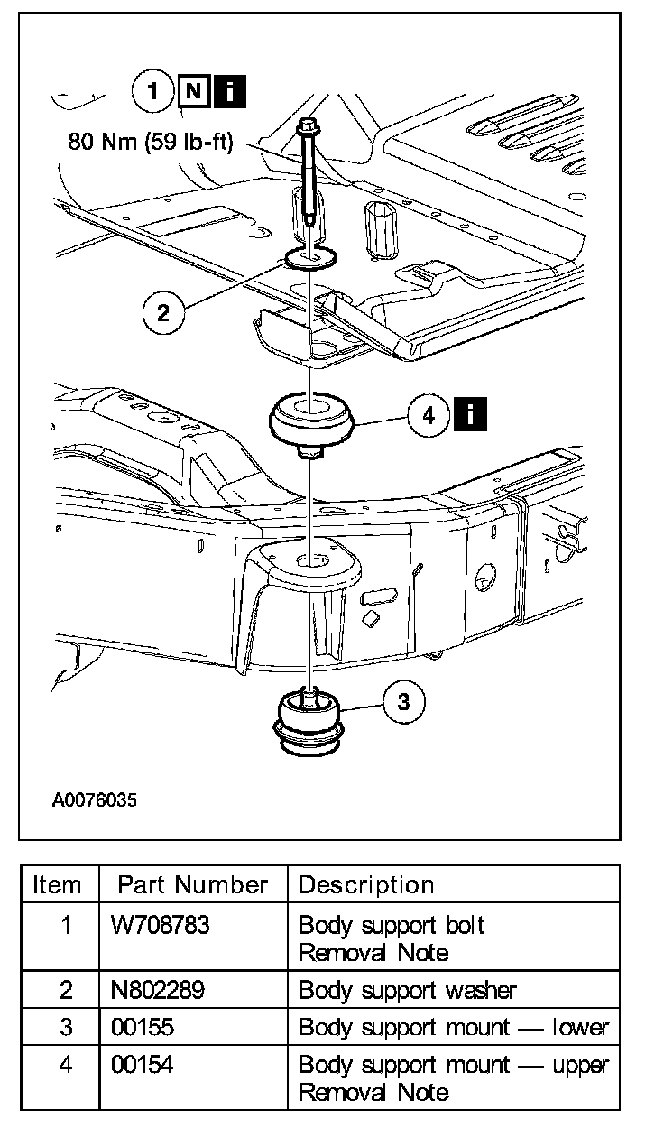 - Do not reuse body support mounting fasteners. New fasteners must be installed for each fastener that has been removed or loosened.