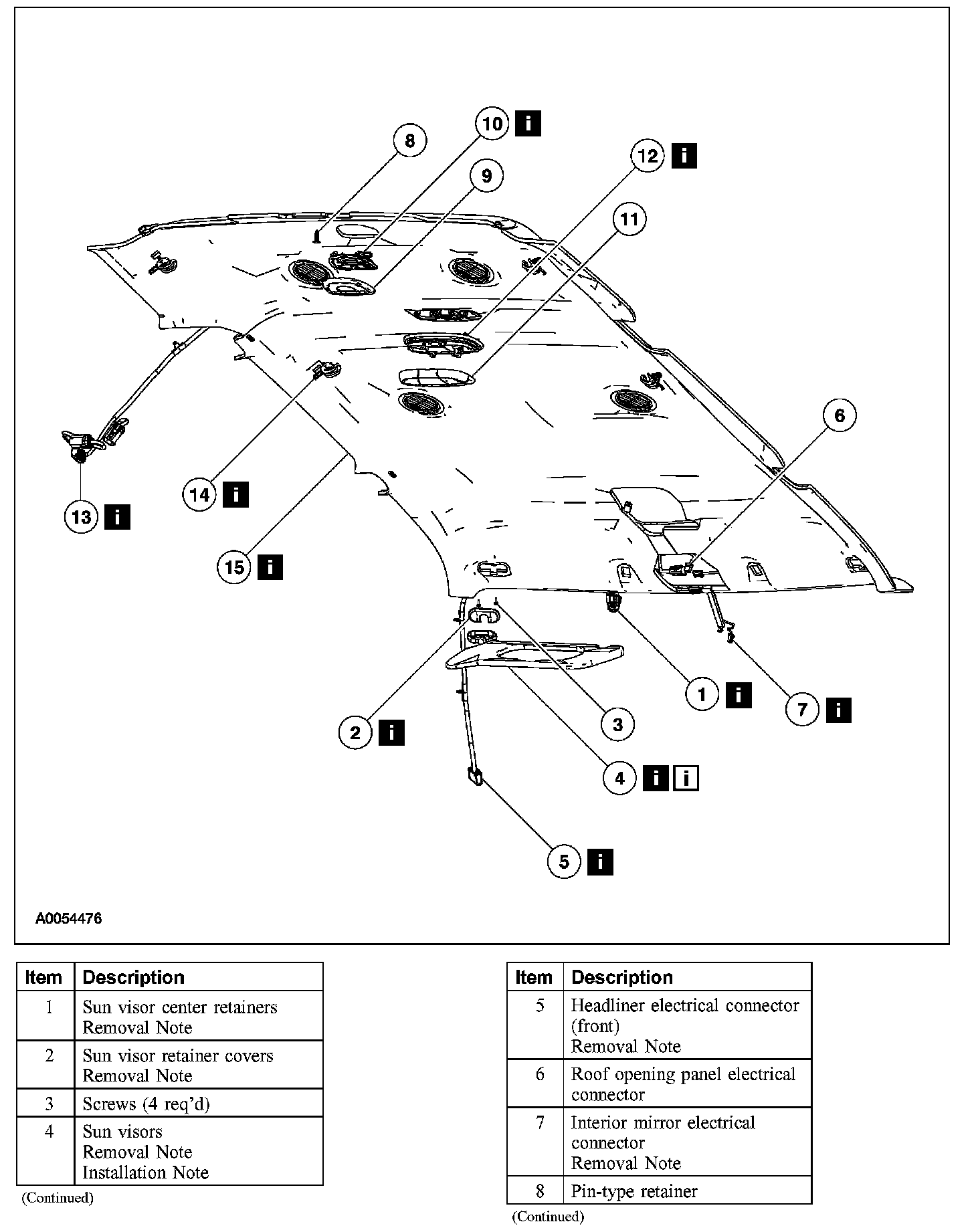 1. CAUTION: To prevent bending the headliner, loosely install the center sun visor retainer to support the headliner after disconnecting the electrical connectors.