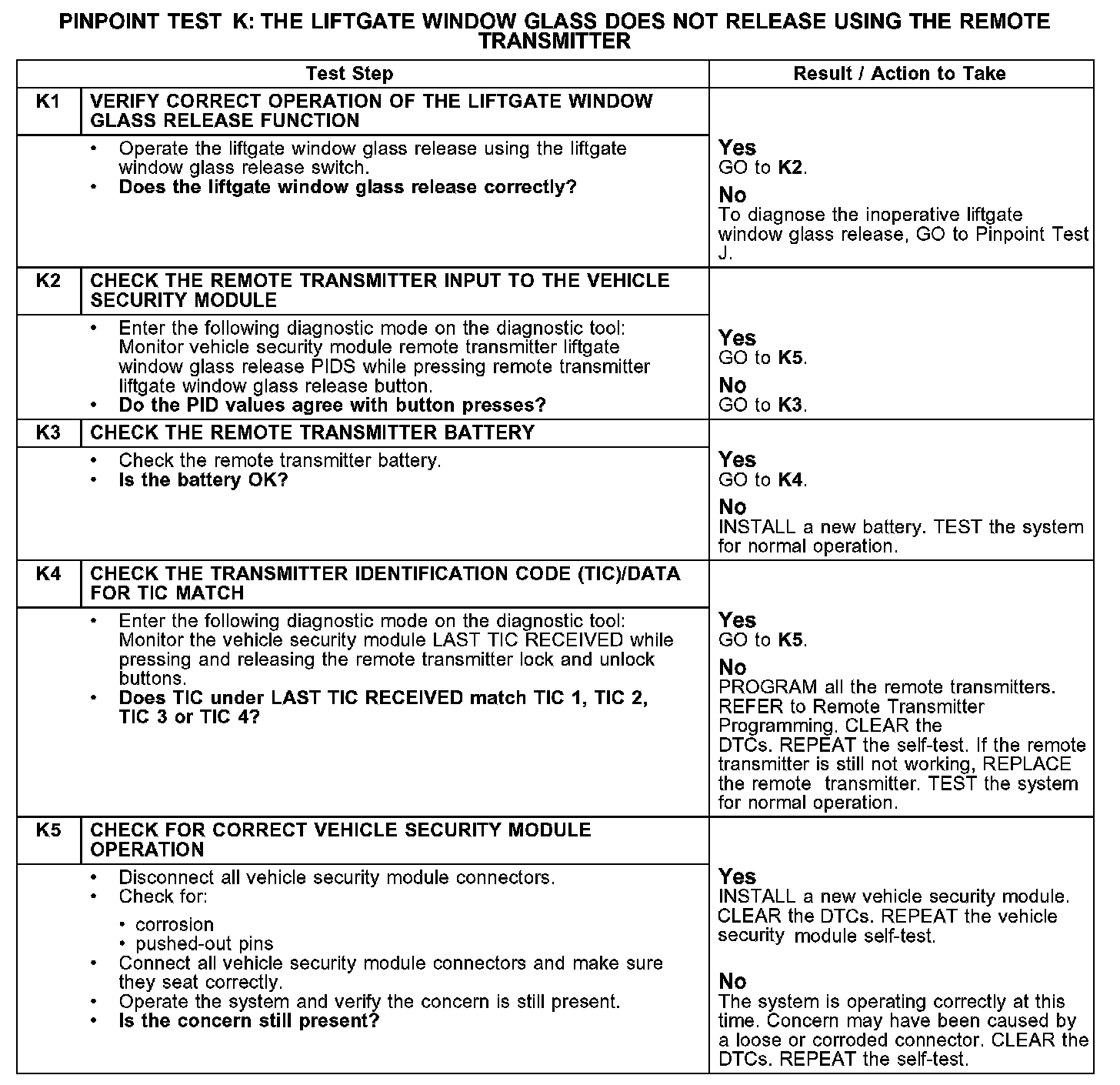 PINPOINT TEST K: THE LIFTGATE WINDOW GLASS DOES NOT RELEASE USING THE REMOTE TRANSMITTERTest K1-K5: