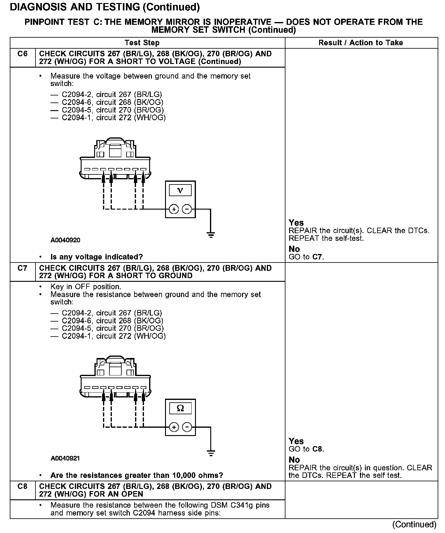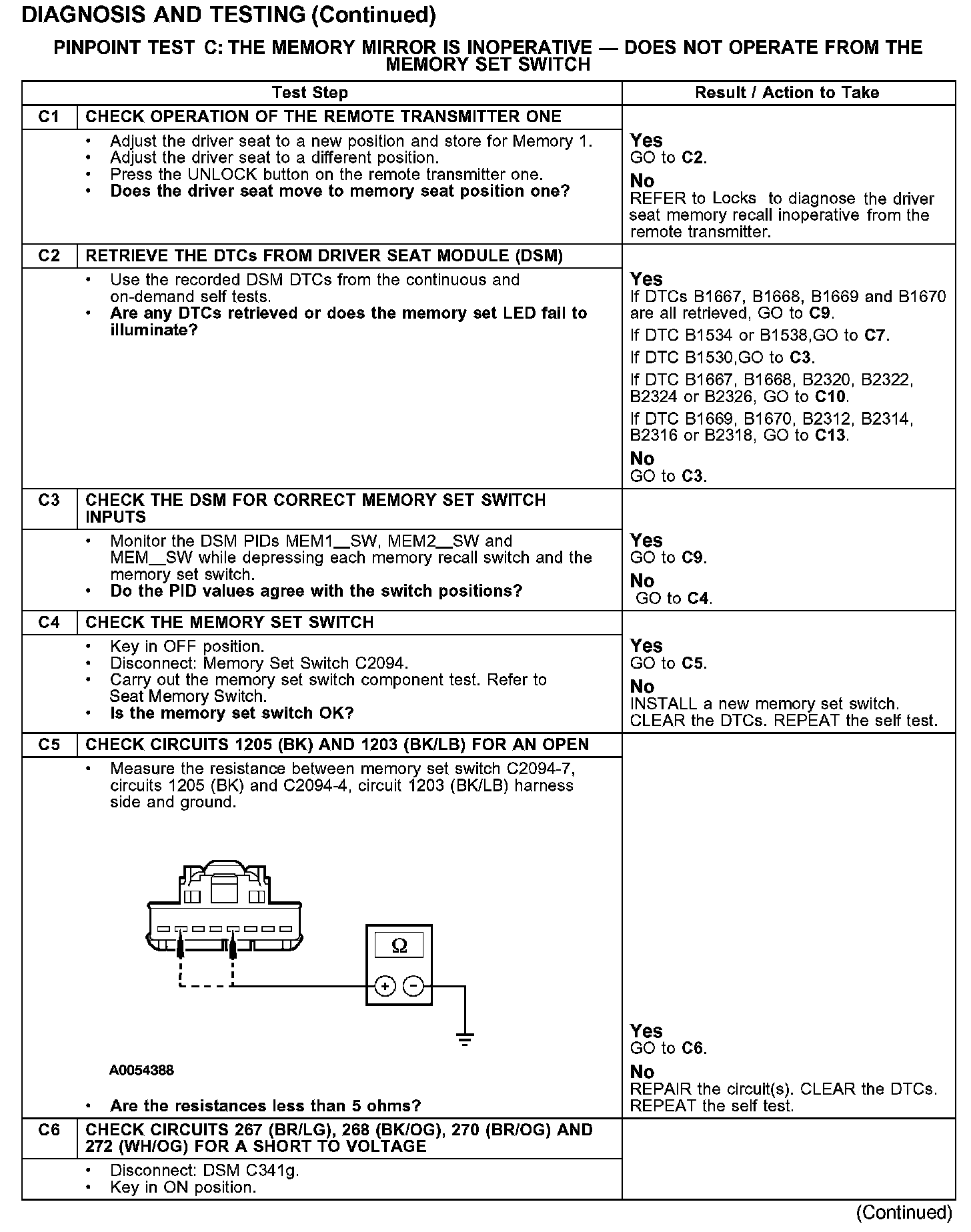 Under normal operation the memory set switch receives ground from circuits 1205 (BK) and 1203 (BK/LB). Once the driver seat module (DSM) receives input from the memory set button circuit 270 (BR/OG) the DSM will save current mirror settings using the inputs from the exterior mirrors. When the DSM receives input from the memory set switch button 1, circuit 267 (BR/LG) or button 2, circuit 268 (BK/OG) the DSM will adjust the mirrors accordingly.