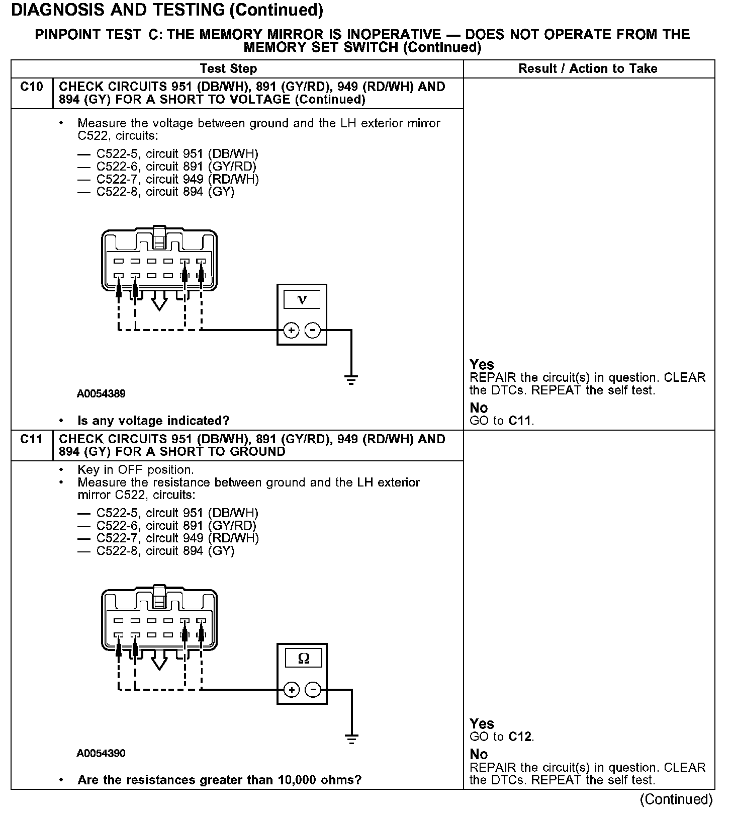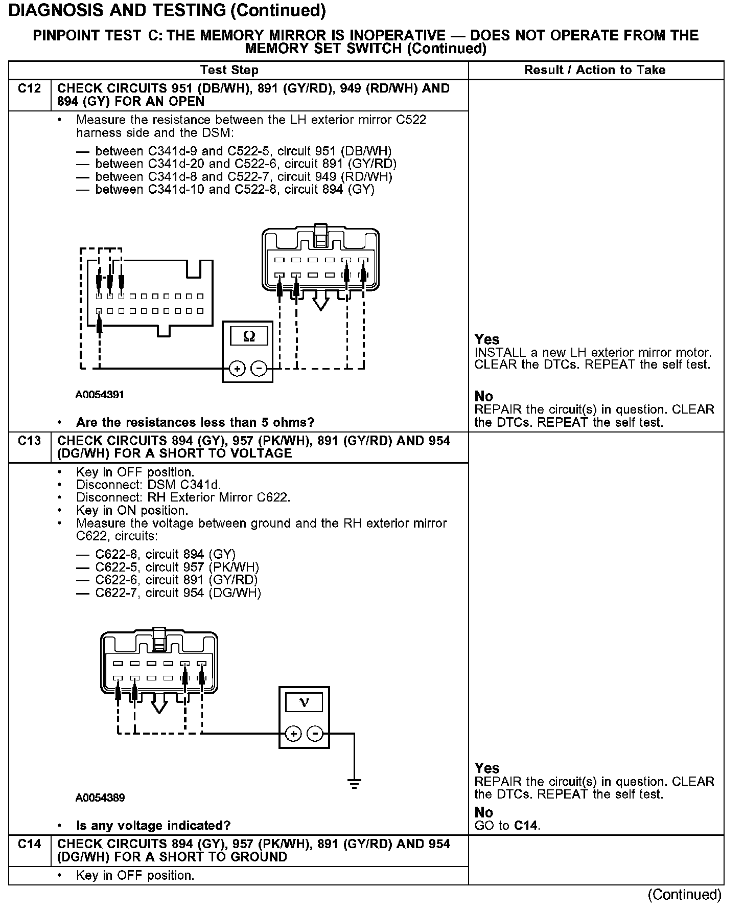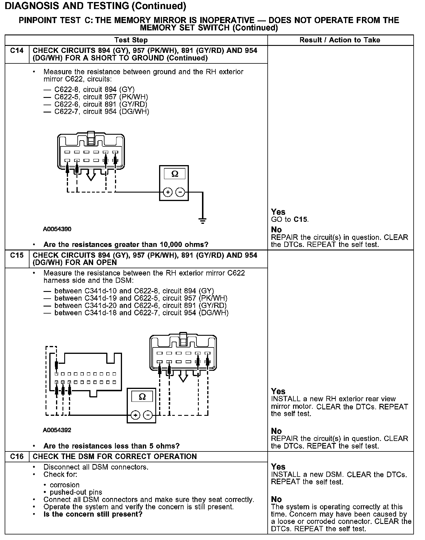 The DSM receives input on the position of the LH exterior mirror from circuits 951 (DB/WH), 891 (GY/RD), 949 (RD/WH) and 894 (GY) and from the RH exterior mirror from circuits 954 (DG/WH), 957 (PK/WH), 891 (GY/RD) and 894 (GY).
