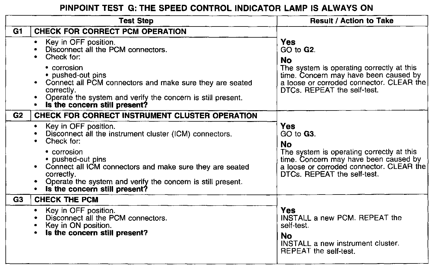 PINPOINT TEST G: THE SPEED CONTROL INDICATOR LAMP IS ALWAYS ONTest G1-G3: