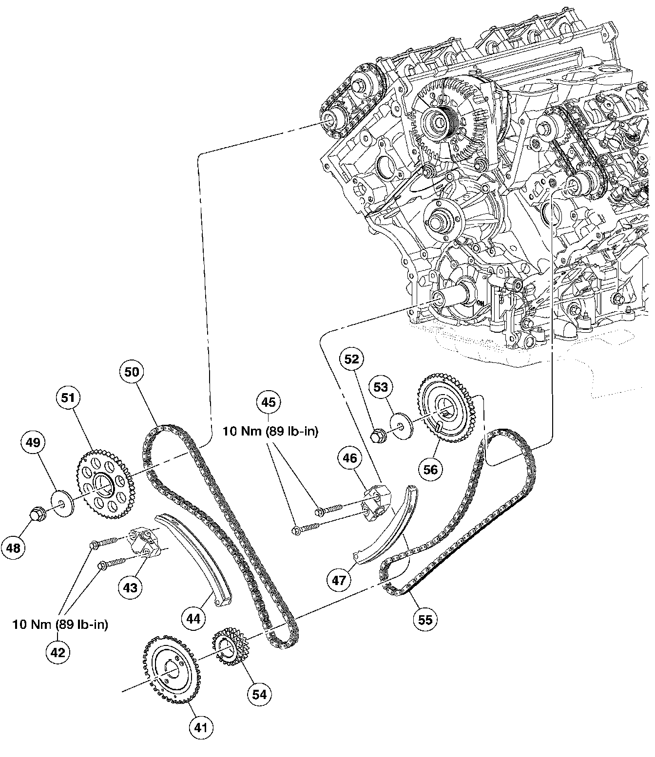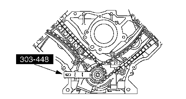 CAUTION: Unless otherwise instructed, at no time when the timing chains are removed and the cylinder heads are installed is the crankshaft or the camshaft to be rotated. Severe piston and valve damage will occur.