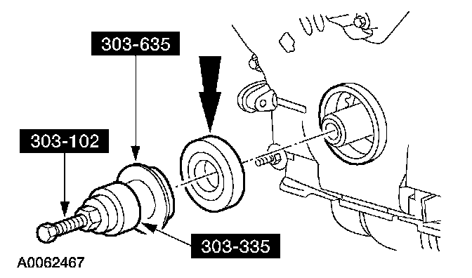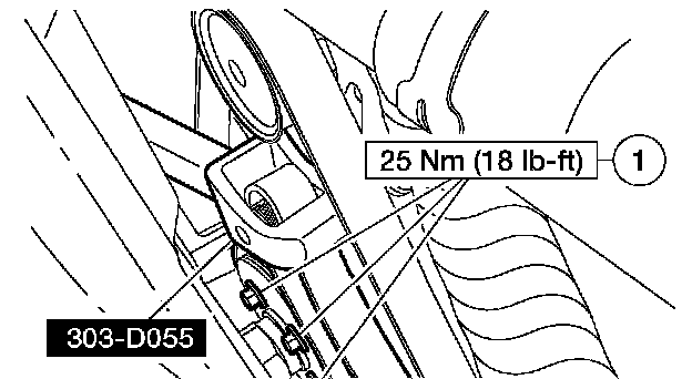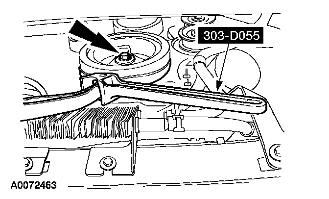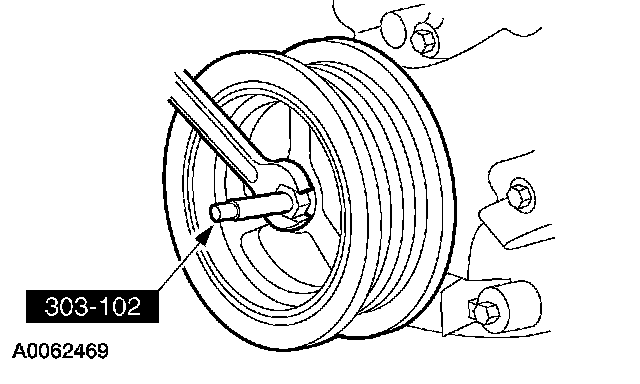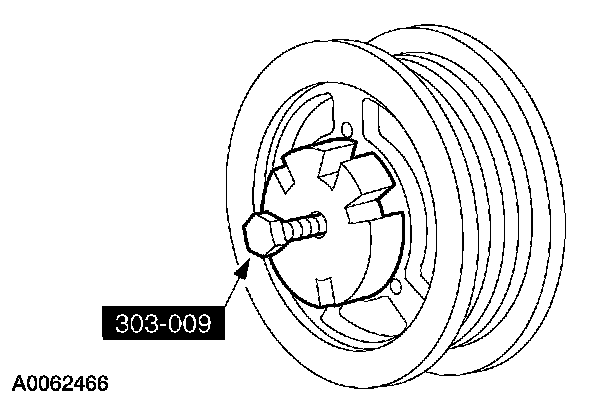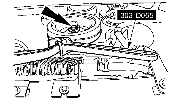 1. To remove the water pump pulley, use special tool 303-D055 to prevent the pulley from turning while removing the bolts.