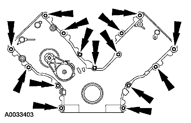 2. Install the engine front cover seals and the engine front cover, and tighten the fasteners in the sequence shown.