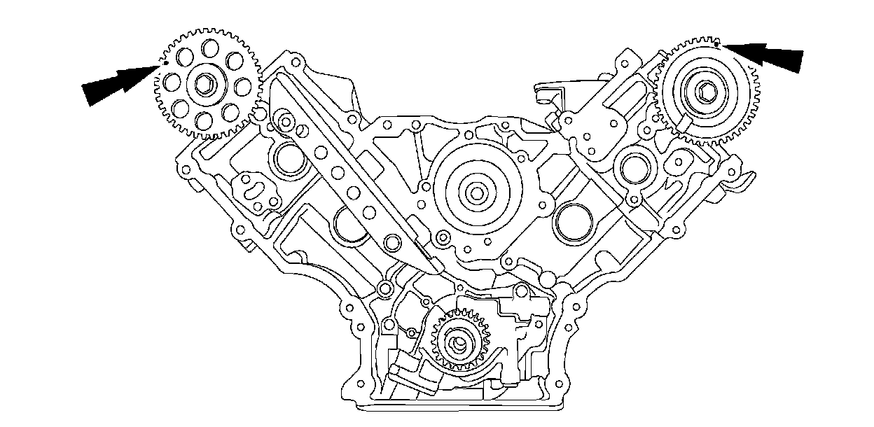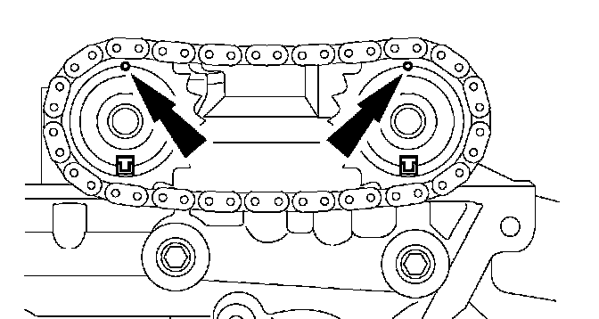 15. Rotate the LH camshaft sprocket until the timing mark is approximately at the 12 o'clock position. Rotate the RH camshaft timing sprocket until the timing mark is approximately at the 11 o'clock position.