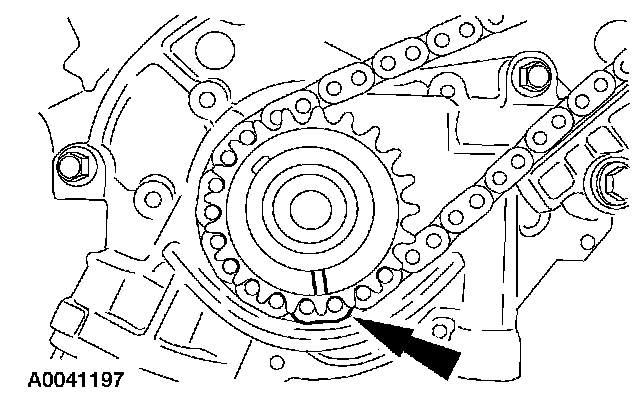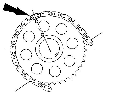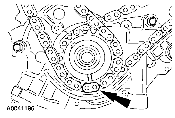 18. Position the LH (inner) timing chain on the crankshaft sprocket, aligning the copper (marked) link with the timing mark on the sprocket.