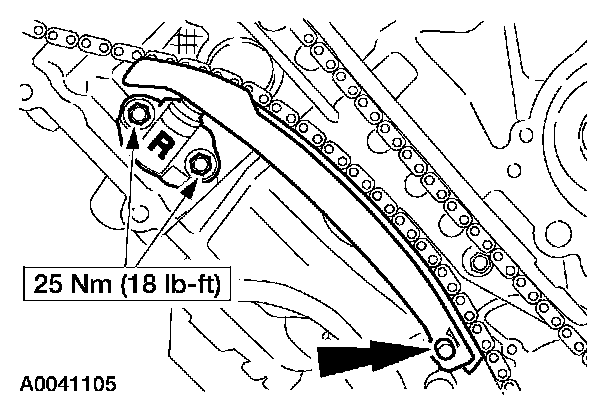 25. Position the RH timing chain tensioner arms on the dowel pin and install the RH timing chain tensioner.