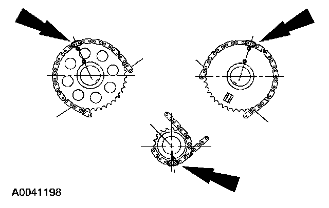 Make sure that the copper (marked) chain links are lined up with the dots on the crankshaft sprockets and the camshaft sprocket.