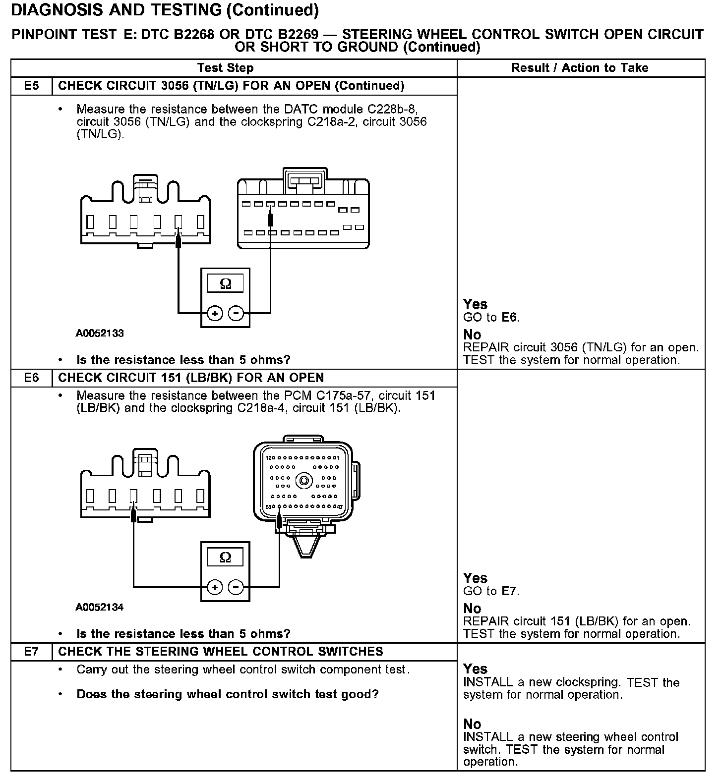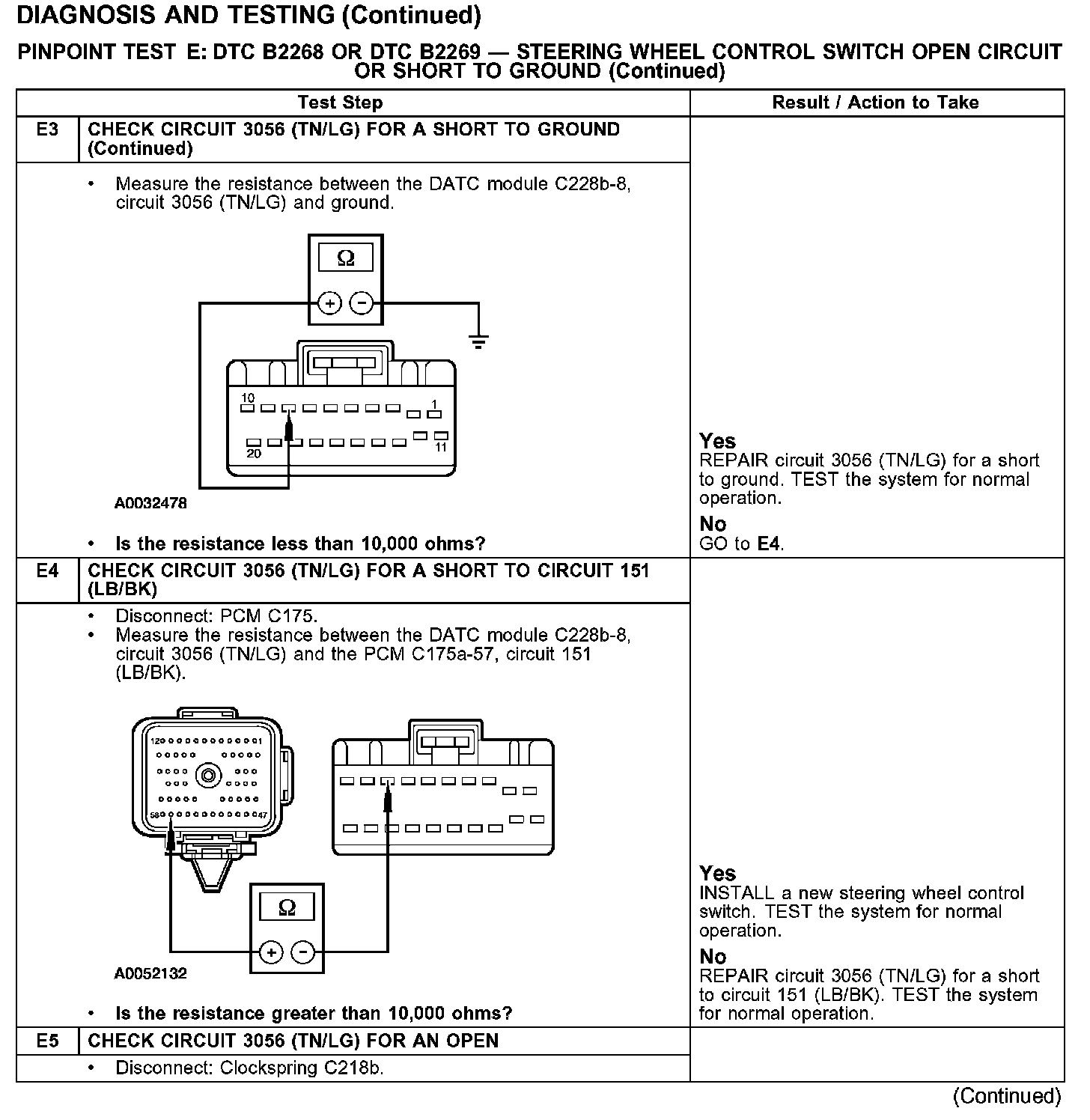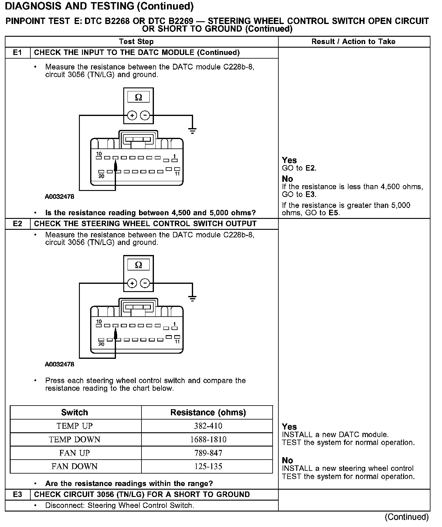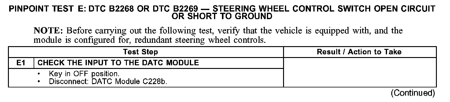 PINPOINT TEST E: DTC B2268 OR DTC B2269 - STEERING WHEEL CONTROL SWITCH OPEN CIRCUIT OR SHORT TO GROUNDTest E1: