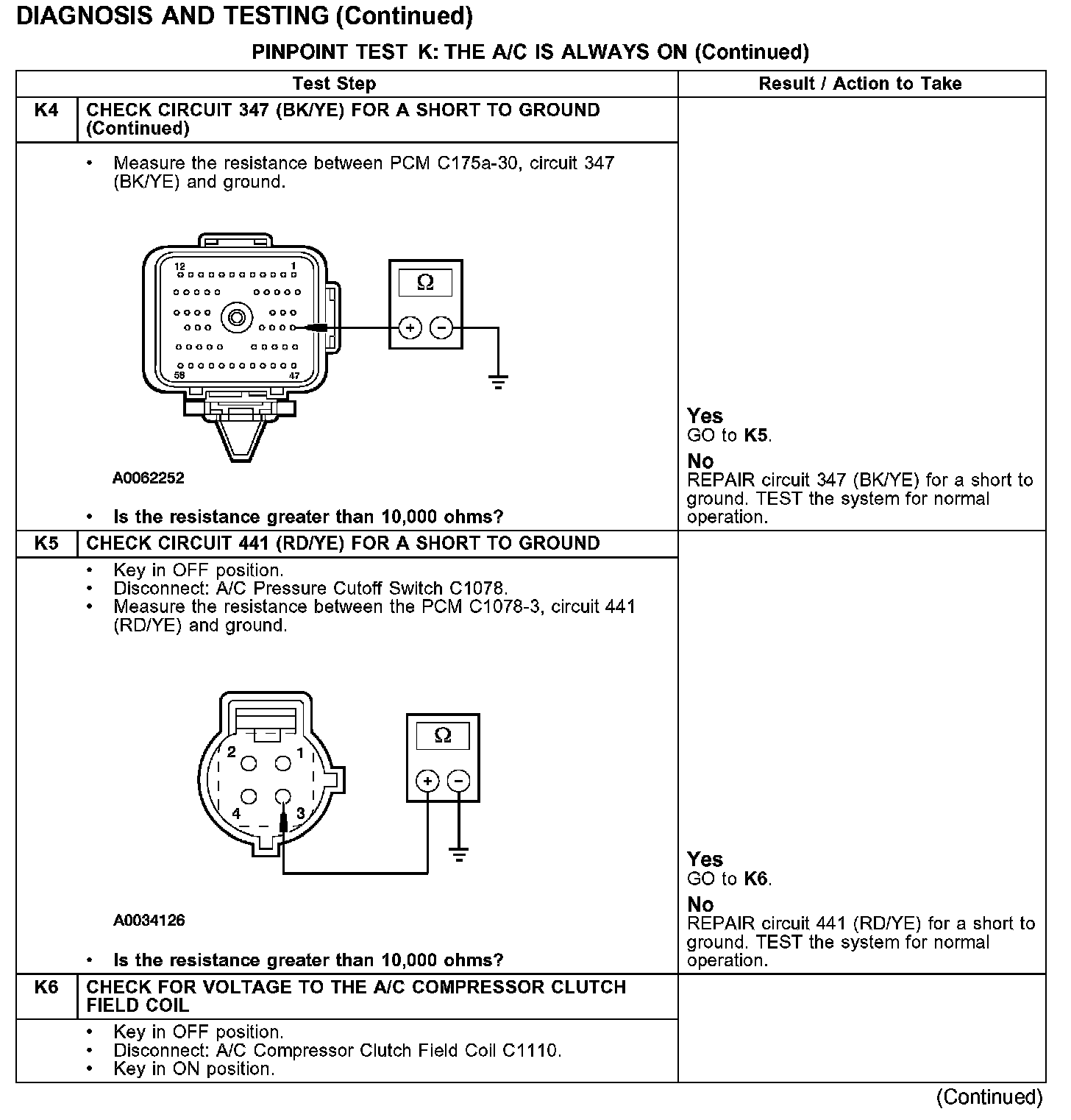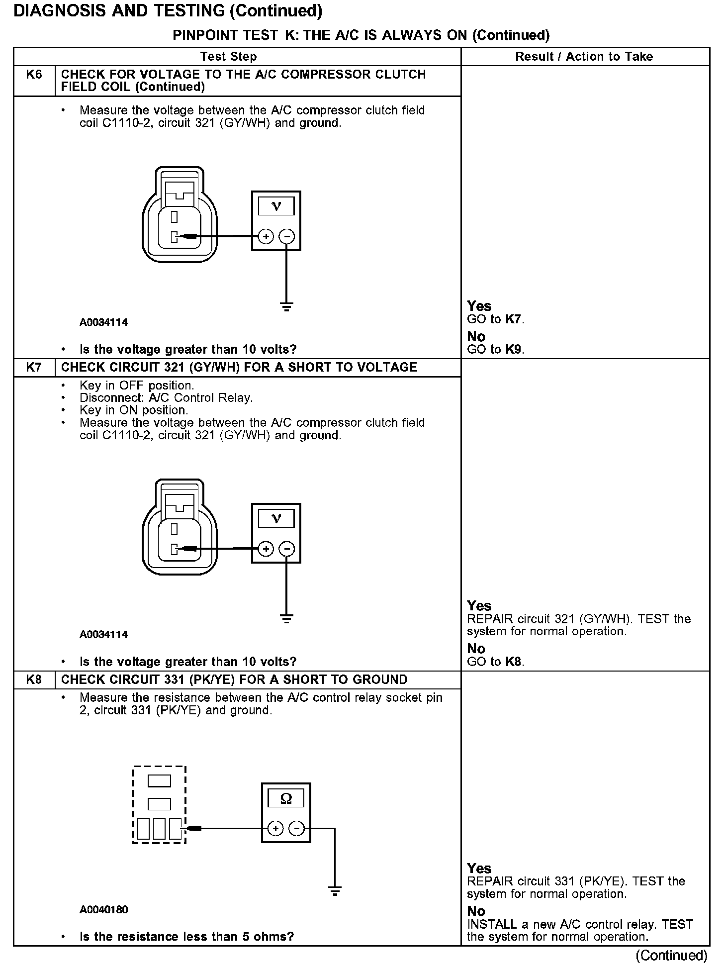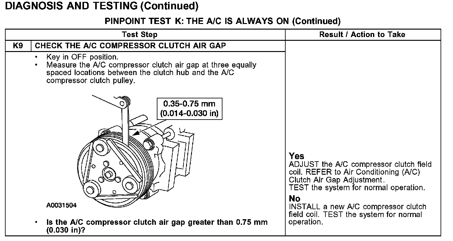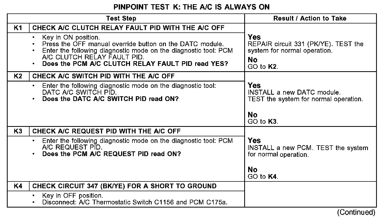 PINPOINT TEST K: THE A/C IS ALWAYS ONTest K1-K4: