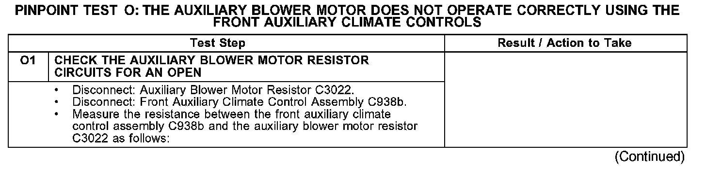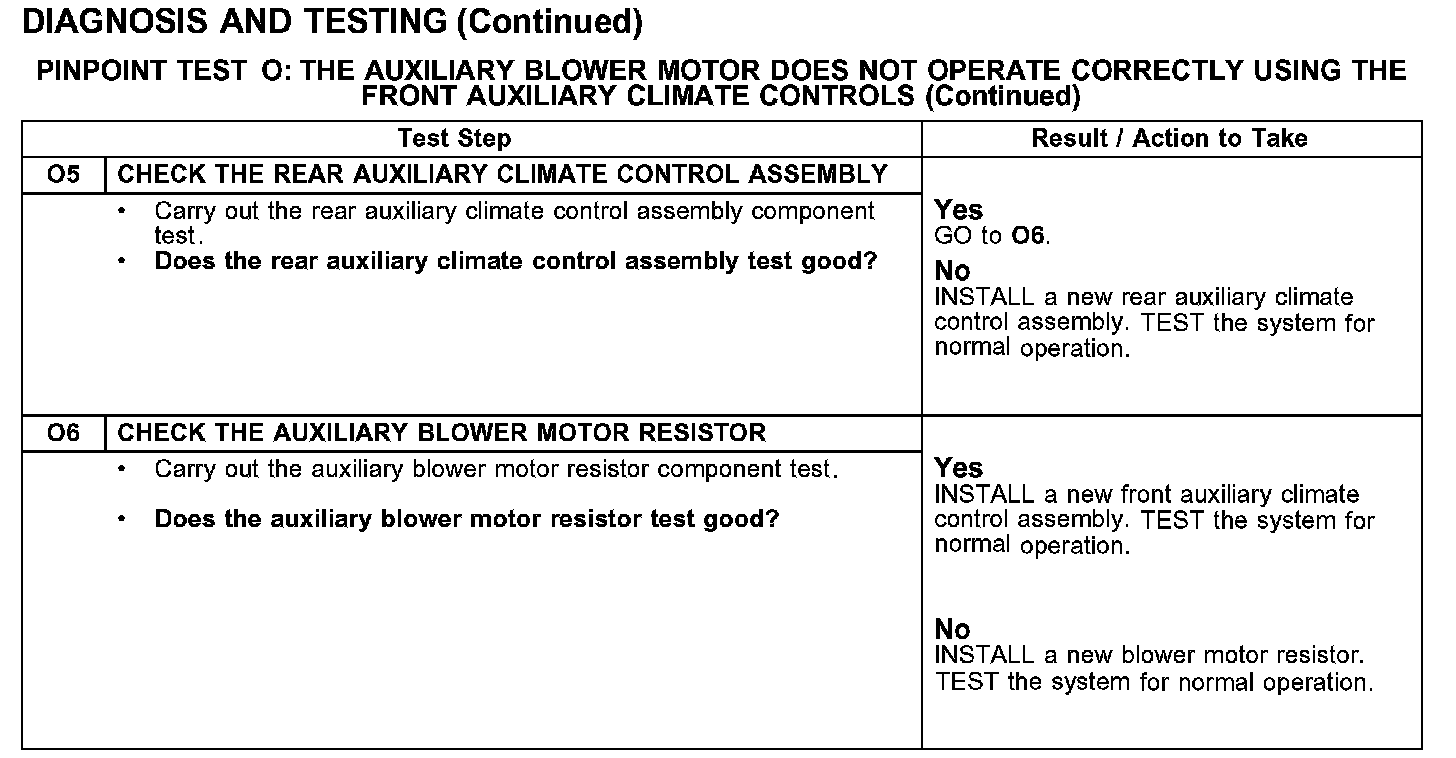 PINPOINT TEST O: THE AUXILIARY BLOWER MOTOR DOES NOT OPERATE CORRECTLY USING THE FRONT AUXILIARY CLIMATE CONTROLSTest O1: