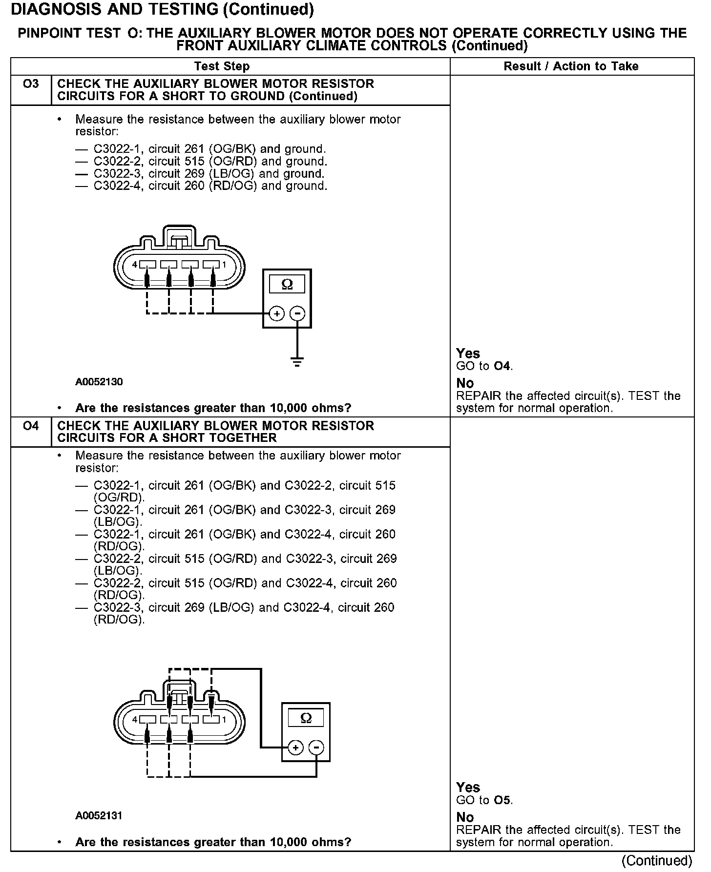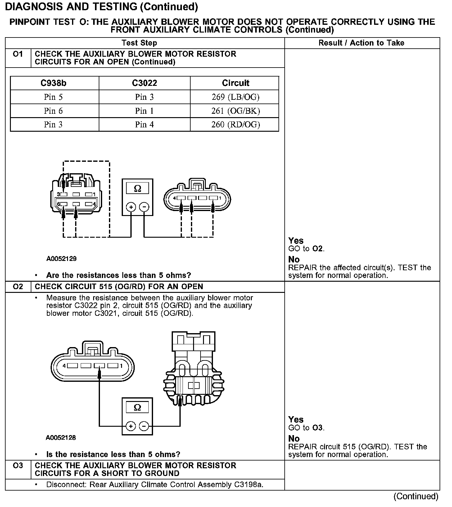 Under normal operation, the blower motor is provided a ground from the resistor through circuit 515 (OG/RD). The resistor gets a ground from the front auxiliary blower switch, depending on selected speed, through circuit 261 (OG/BK), 269 (LB/OG) or circuit 260 (RD/OG).
