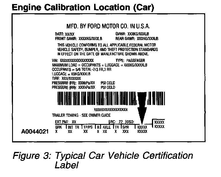Base Engine Calibration Information also sometimes refer to as the Powertrain Calibration is located in the lower right corner of the Vehicle Certification (VC) Label. Engine calibration information is limited to a maximum of five characters per line (two lines maximum). Calibration information more than five characters long will wrap to the second line of this field. Only the Base Calibration will appear on this label, see (Figure 3) for Car and (Figure 4) for Truck. The Revision Level is no longer printed on the label; however, it can be found in On-Line Automotive Service Information System (OASIS). For more information on Vehicle Certification Label or Engine Calibration, refer to Vehicle/Application and ID.