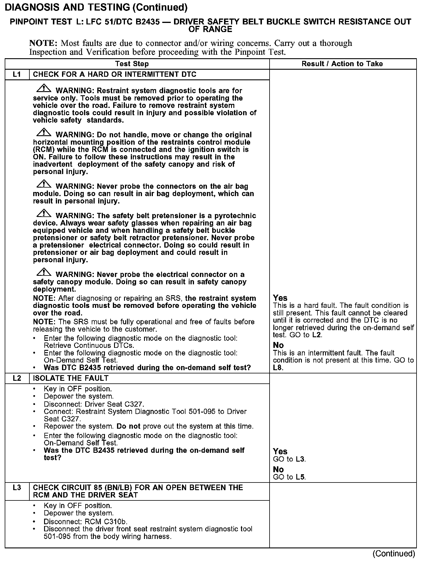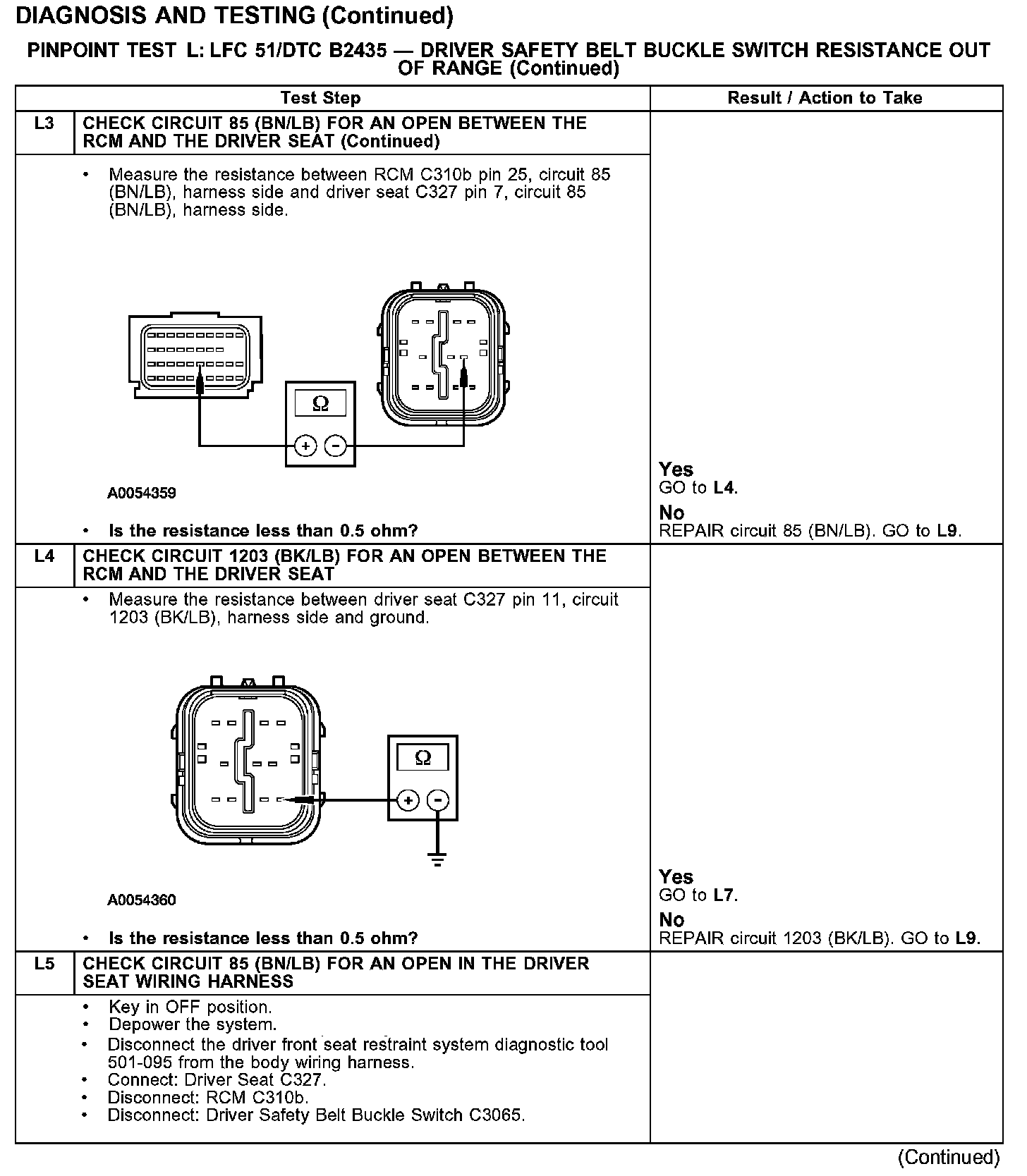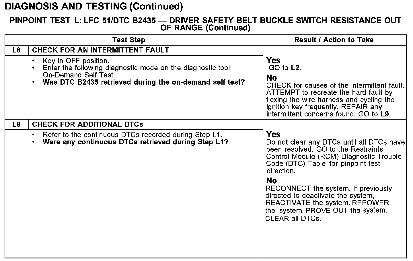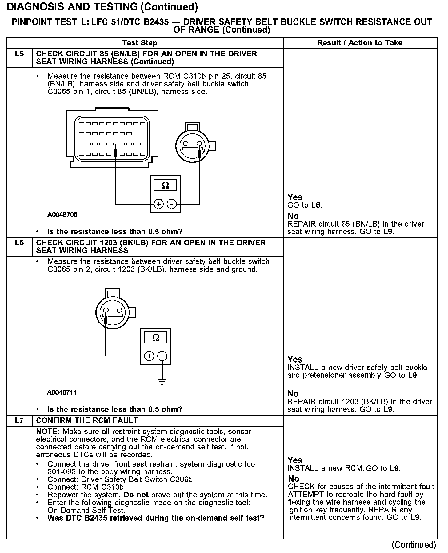 PINPOINT TEST L: LFC 51/DTC B2435 - DRIVER SAFETY BELT BUCKLE SWITCH RESISTANCE OUT OF RANGETest L1-L3: