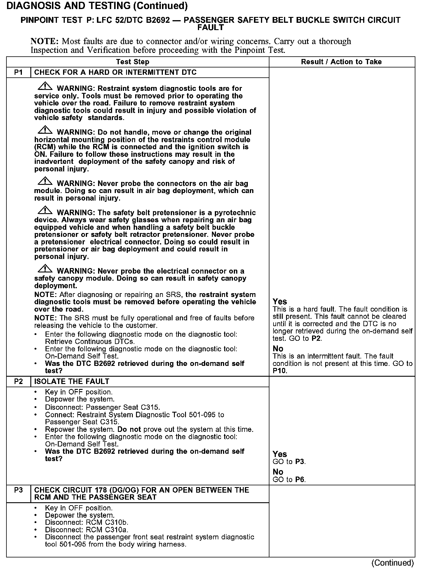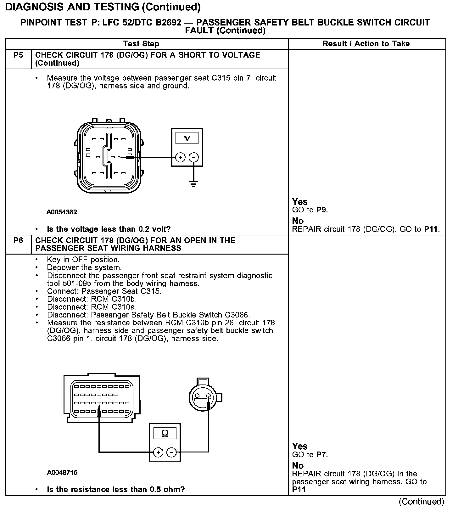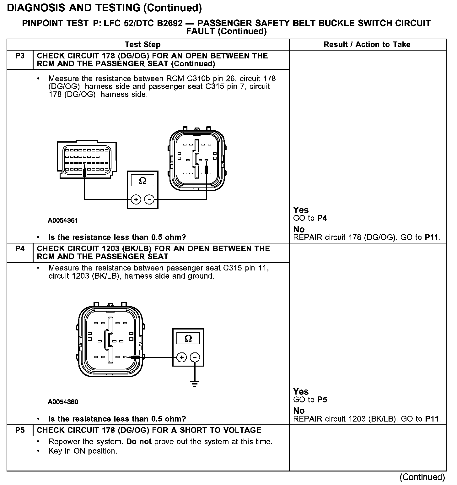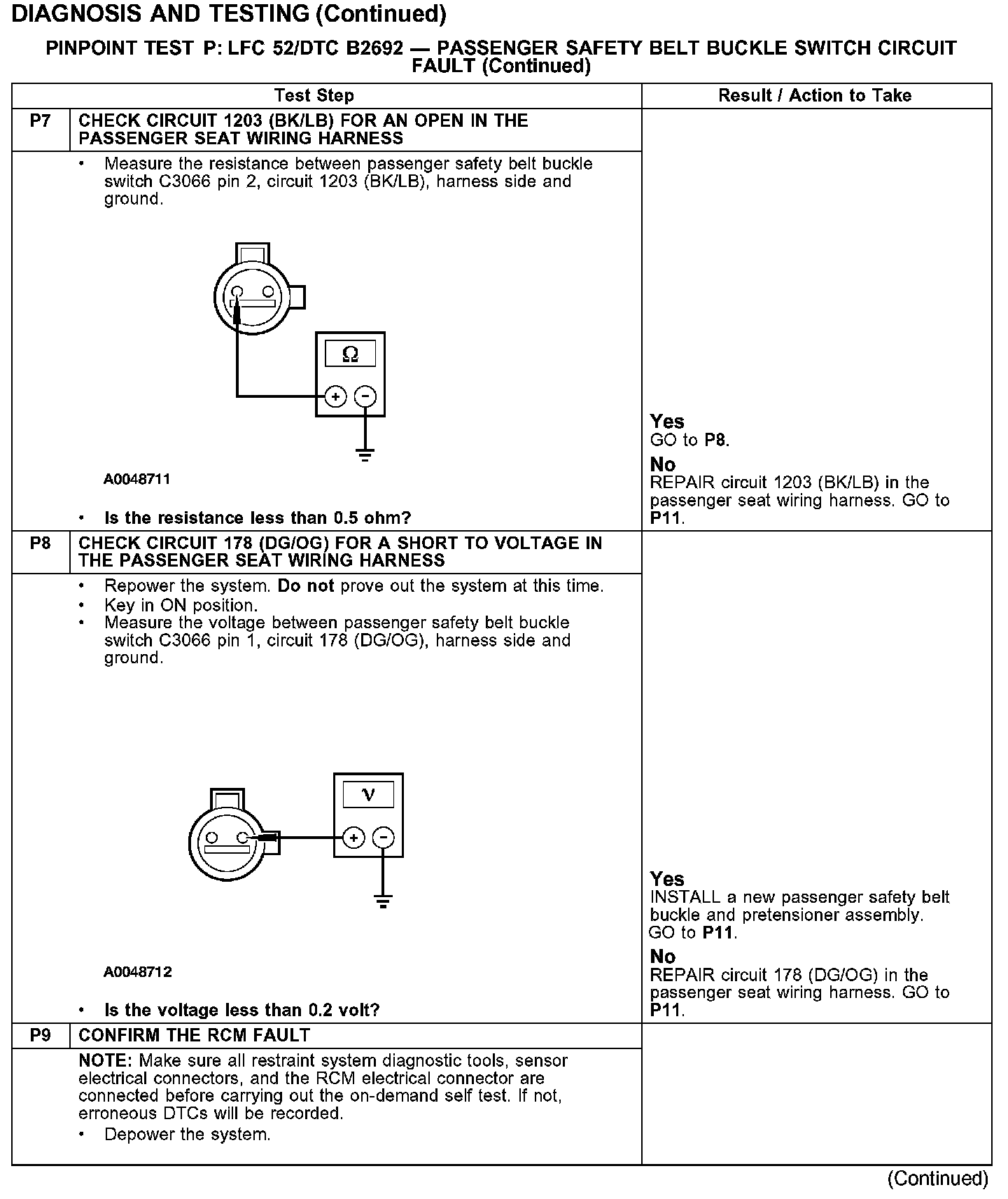 PINPOINT TEST P: LFC 52/DTC B2692 - PASSENGER SAFETY BELT BUCKLE SWITCH CIRCUIT FAULTTest P1-P3:
