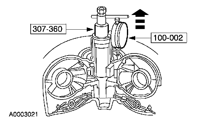 3. Lift up on the special tool and note the dial indicator reading. If the reading exceeds end play limits, install a new or rebuilt torque converter.